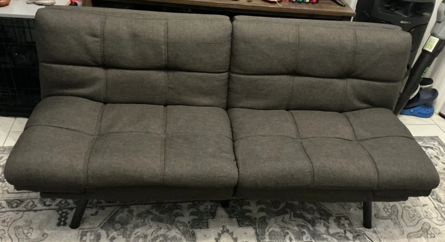 Selling a dark grey convertible futon sofa bed! It's perfect for sitting, lounging, or even sleeping. The sofa bed has a 3-position adjustment to meet your needs. Dimensions are 71" x 33" x 31.5" when used as a sofa, and 71" x 42" x 16" when used as a bed