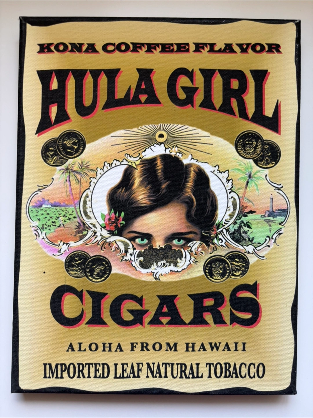 Add a touch of Aloha to your space with this Hula Girl Cigars canvas art! Featuring Kona Coffee Flavour and the words 'Aloha from Hawaii Imported Leaf Natural Tobacco', this piece brings a unique vibe to any room