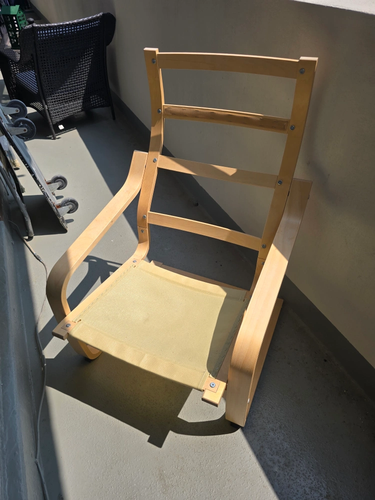 Selling a gently used IKEA Poang chair. It's a light wood frame with a beige canvas seat. Perfect for relaxing in your living room or bedroom!