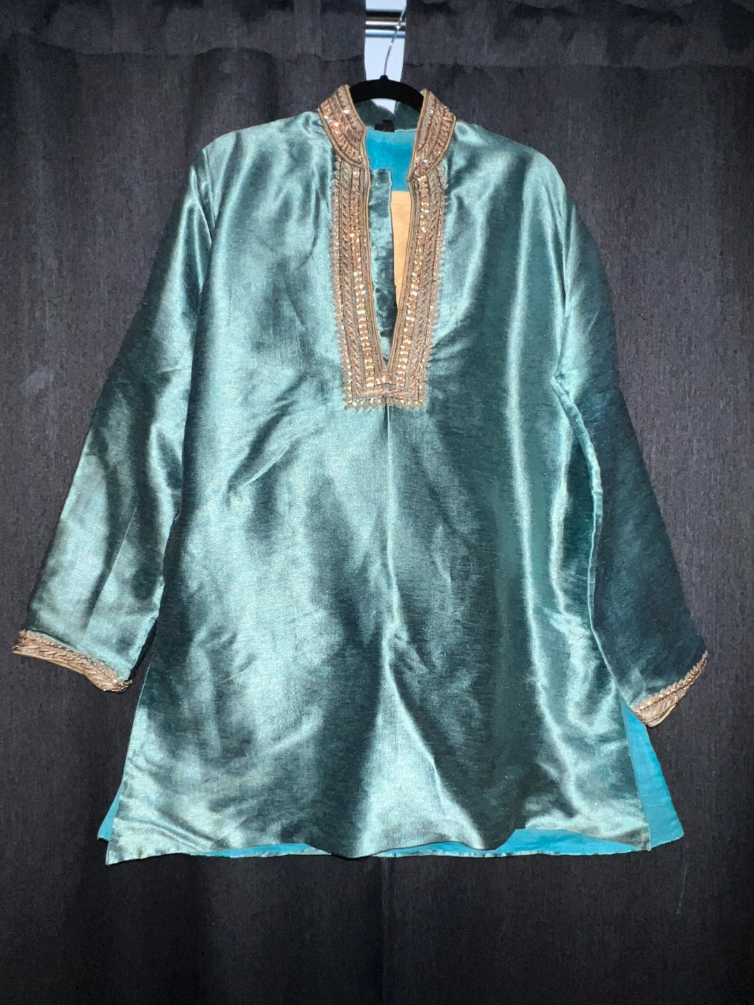 10Here's a teal men’s Indian outfit with gold detailing. It's in great condition and ready for a new home! The material feels like silk. Comes with top and bottom