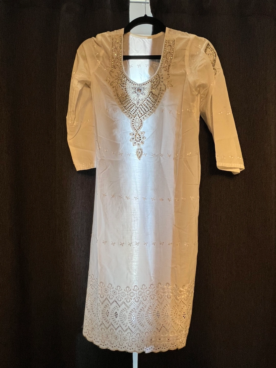 Here's a lovely white Indian top with beautiful embroidery detailing. It's perfect for adding a touch of elegance to your wardrobe. Is in great condition and ready for a new home!
