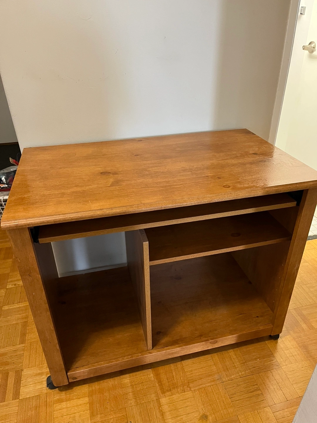 Here's a Sturdy Light Coloured Wooden Desk with a handy Pull-out Keyboard Tray!It's got some open shelving underneath for storage or display. Perfect for a Home Office or Study Space. Great for Students of All Ages. Good Condition. Desk is on Wheels for easy maneuvering.