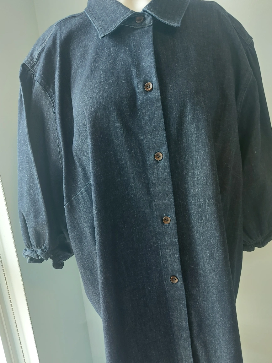 Selling a gently used NYDJ denim shirt dress in size 4X. It's a stylish and comfortable piece that's perfect for casual outings or dressing up. The dark denim colour is versatile and easy to match with different accessories. It features button-down closure and a relaxed fit. Feel free to message me with any questions!