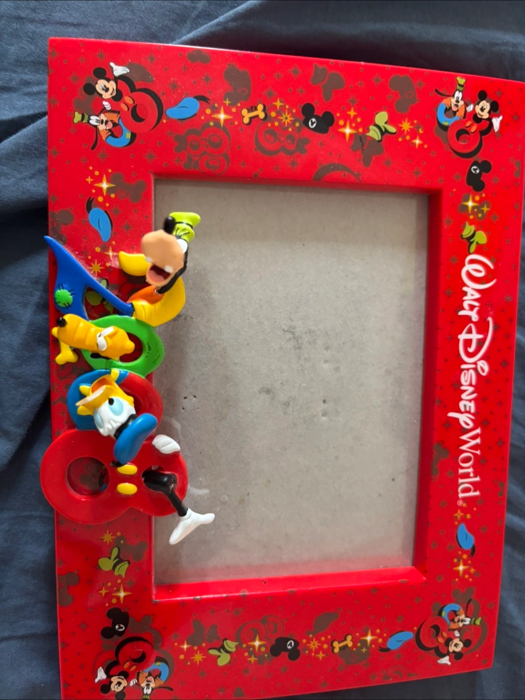 A fun Walt Disney World photo frame featuring Mickey Mouse, Goofy, and Donald Duck! It's a decorative picture frame for a Walt Disney fan . Originally priced USD 20. Great for adding a touch of Disney magic to any room!