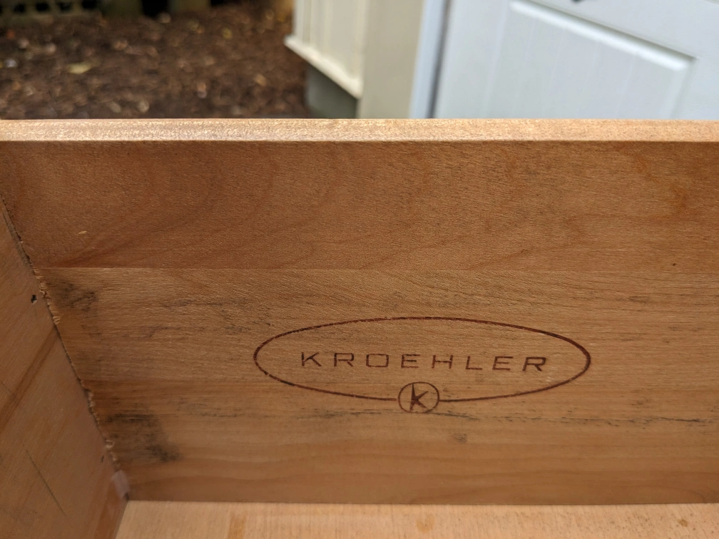 This wood dresser by quality craftsmen, Kroehler features 9 spacious drawers that all open and close smoothly. The drawer interiors are all in excellent condition. The drawer pulls have an antiqued bronze finish.