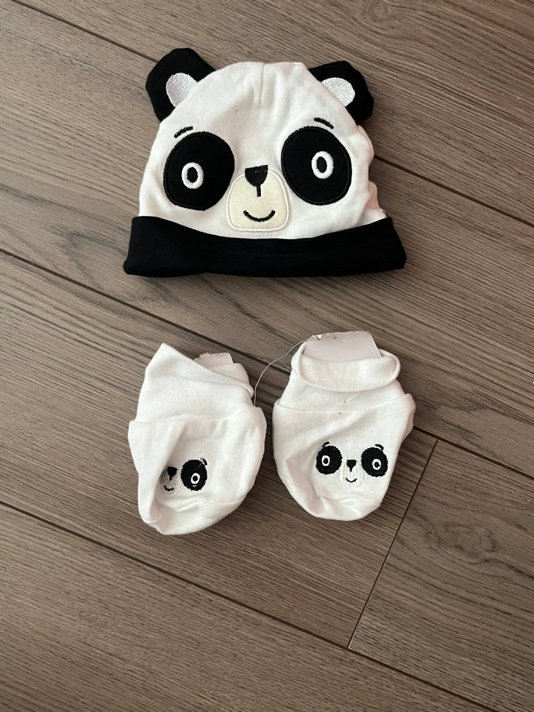 31Super cute panda themed hat and mitten set for newborns! The hat is white with black panda features and the mittens have matching panda faces. Perfect for keeping your little one warm and stylish! Pick up at Brow of the Hill near 10th and Royal, New Westminster. Check out my other listings!