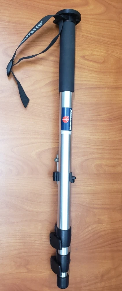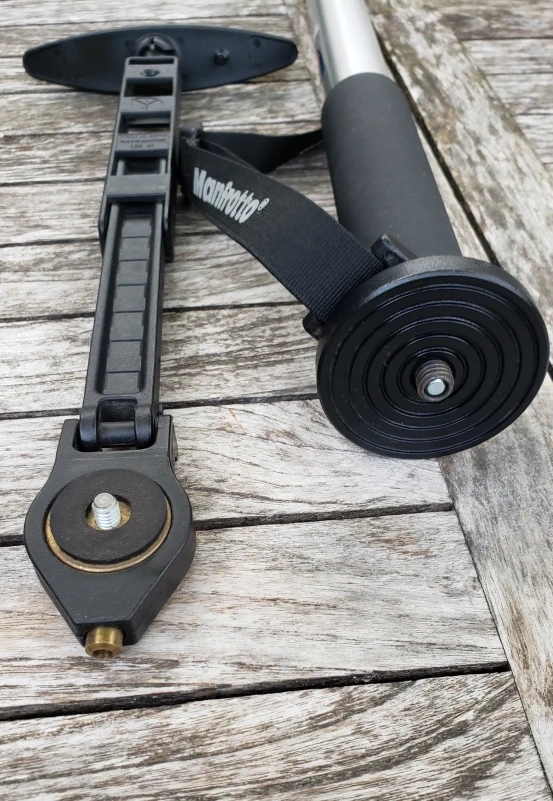 Manfrotto 679 monopod with a 361 shoulder brace and a monopod belt pouch for added stability and ease of movement without bearing the full load while holding it. The pouch makes using the monopod and attached camera much easier.