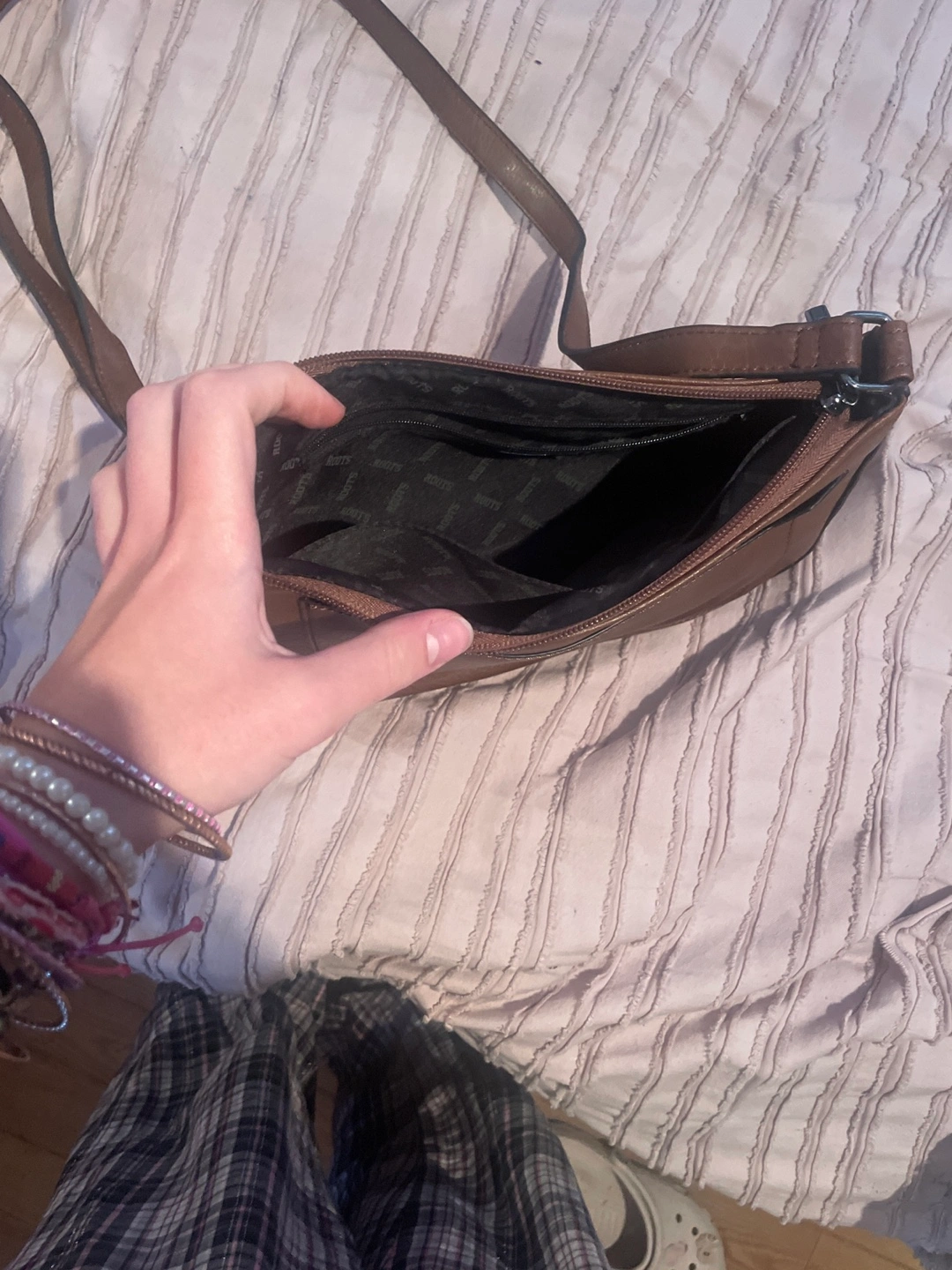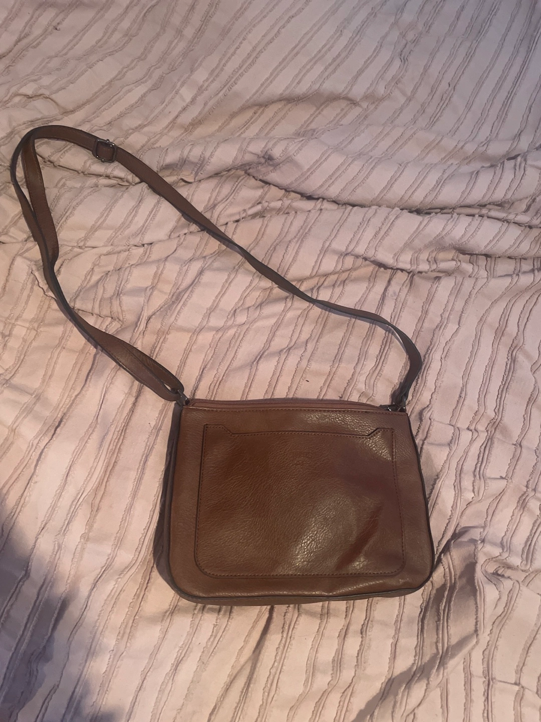 A never used brown Roots crossbody bag. medium size, good for everyday use. has adjustable straps and compartments.