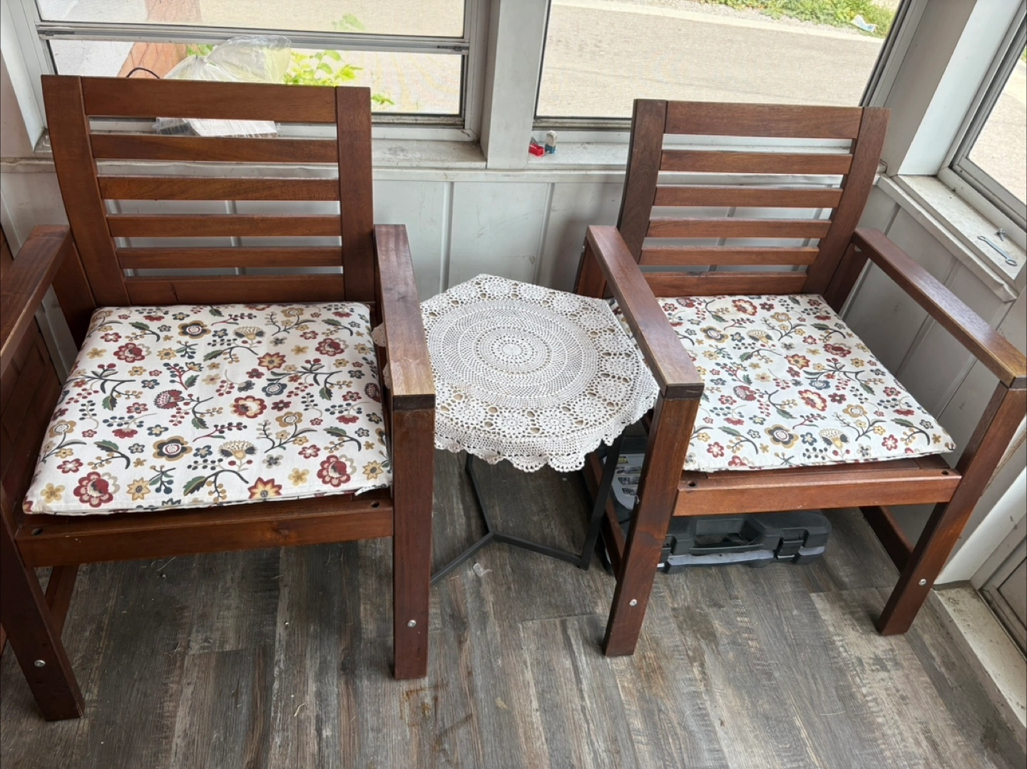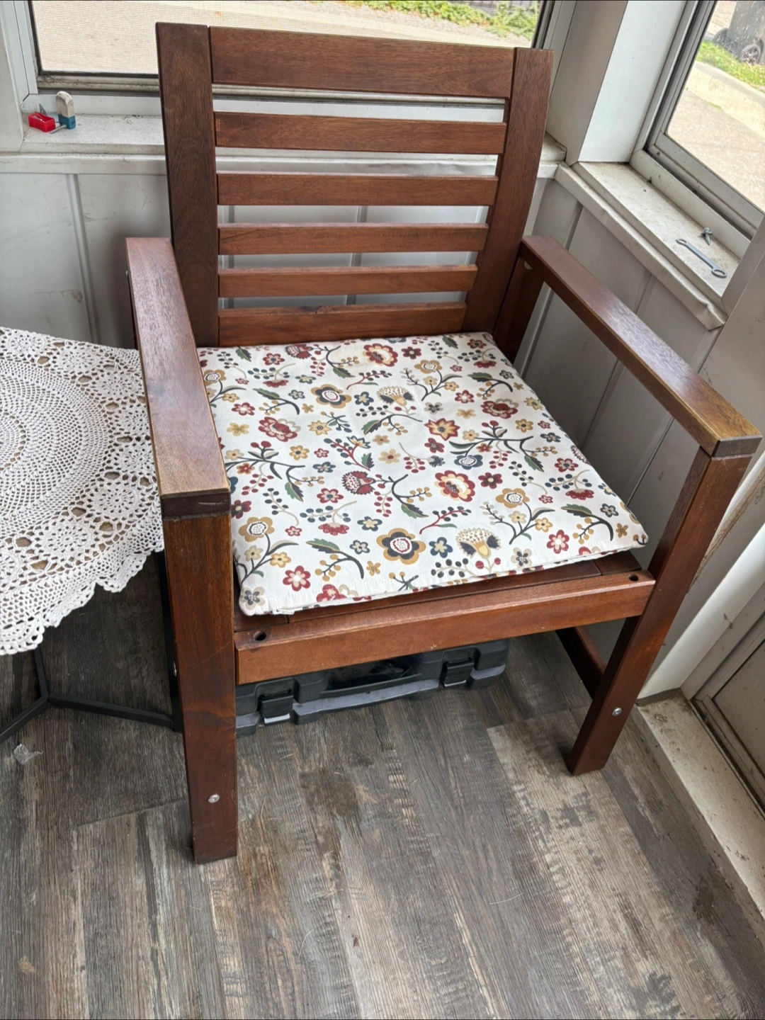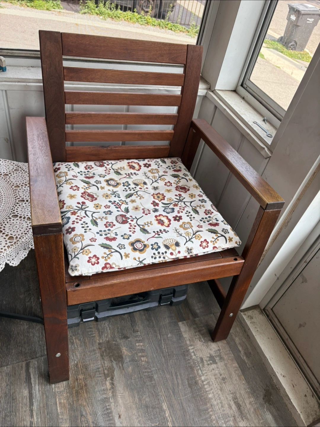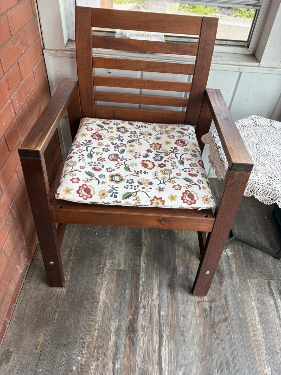 24Selling a lovely wooden armchair with a comfy floral cushion! It's in great shape and would look perfect in a sunroom or on a porch. The wood has a nice warm tone, and the cushion adds a touch of charm