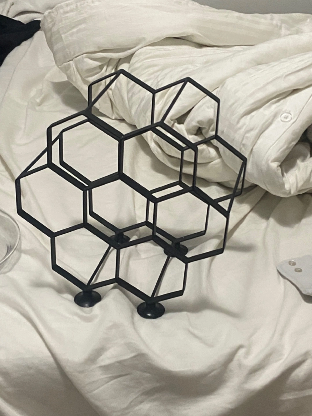 Selling a modern black metal wine rack! It's in great shape and ready to hold your favourite bottles. Perfect for adding a touch of style to your kitchen or dining area. Can also sell couple Bottle of caymus cab and two other high end cabs with this all well