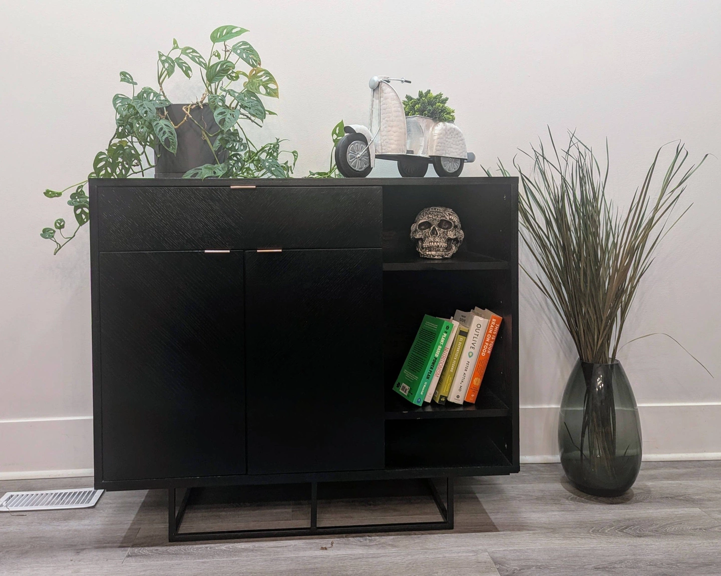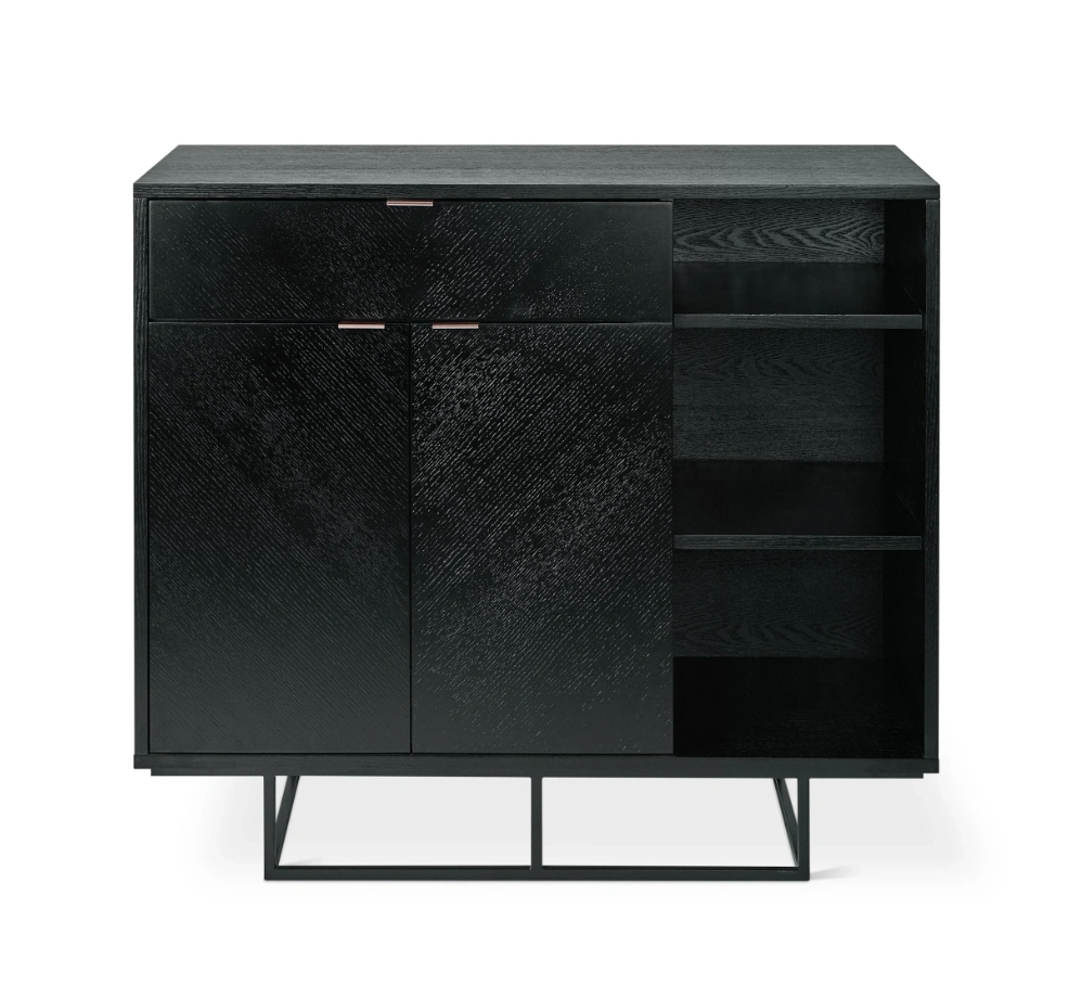 Selling a beautiful and modern Gus* Modern Myles Cabinet, originally purchased from Stylegarage. This versatile sideboard features a black oak finish with a striking chevron pattern on the doors and contrasting rose gold handles. It stands on a slender, black powder-coated steel base, giving it a sleek, elevated look.