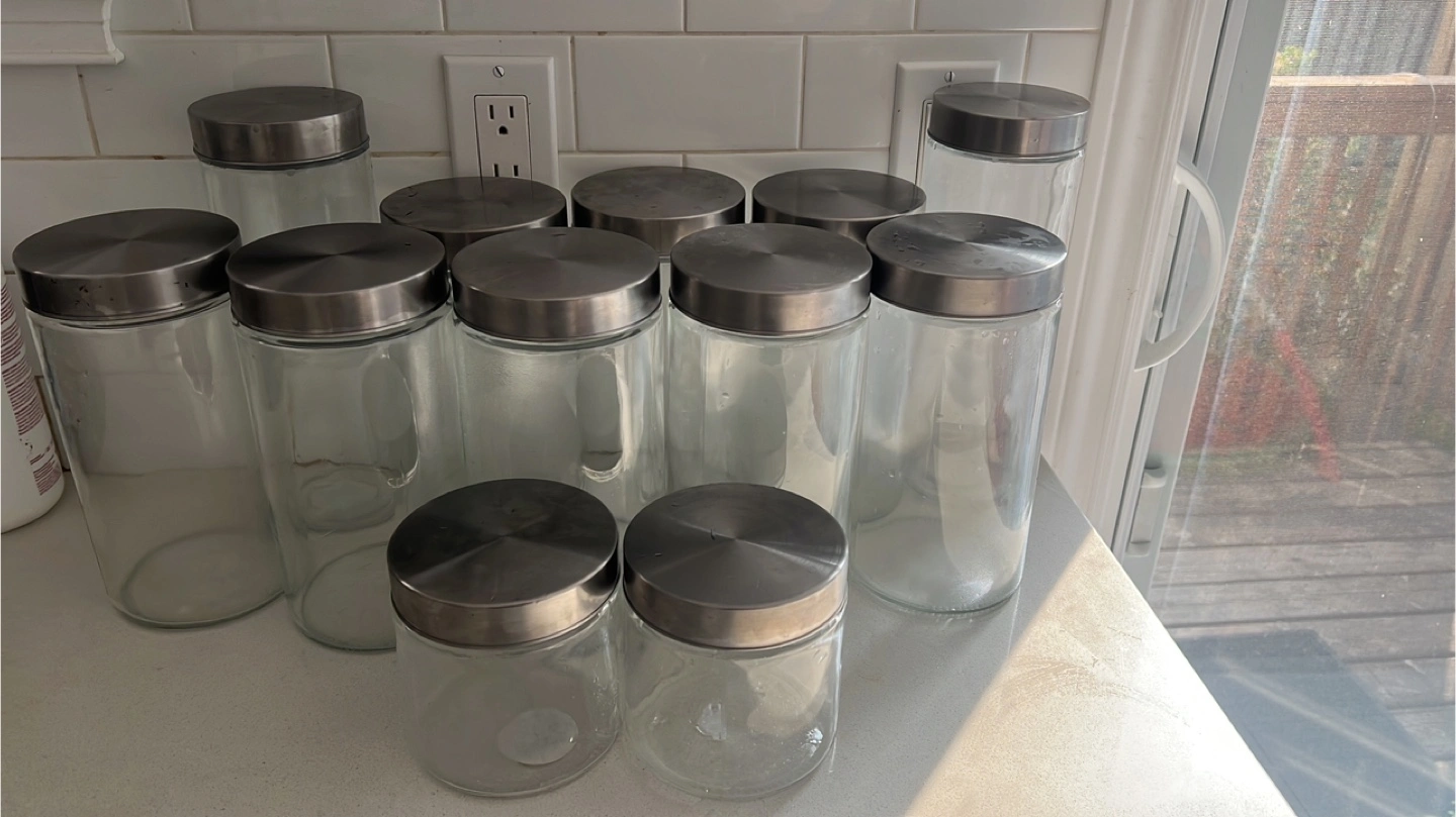 Selling a set of glass storage jars with stainless steel lids! They're great for organizing your pantry or storing dry goods. There are 10 jars in total, a mix of short and tall ones.