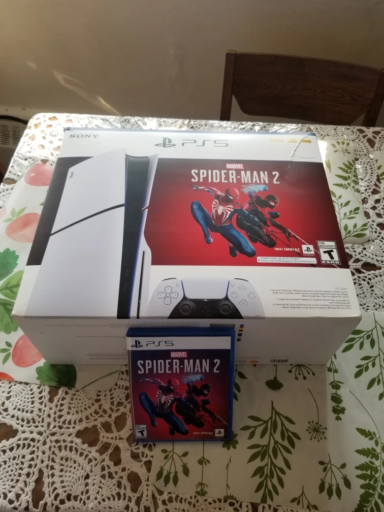 Basically New Condition PS5 Slim Disc Spiderman 2 Edition Console Bundle with all Accessories and Spiderman 2 Disc Game Everything is in Really Good Condition and Has Been Tested Console is Factory Reset Ready to Go π₯π€ Asking $530 Cash Thxs