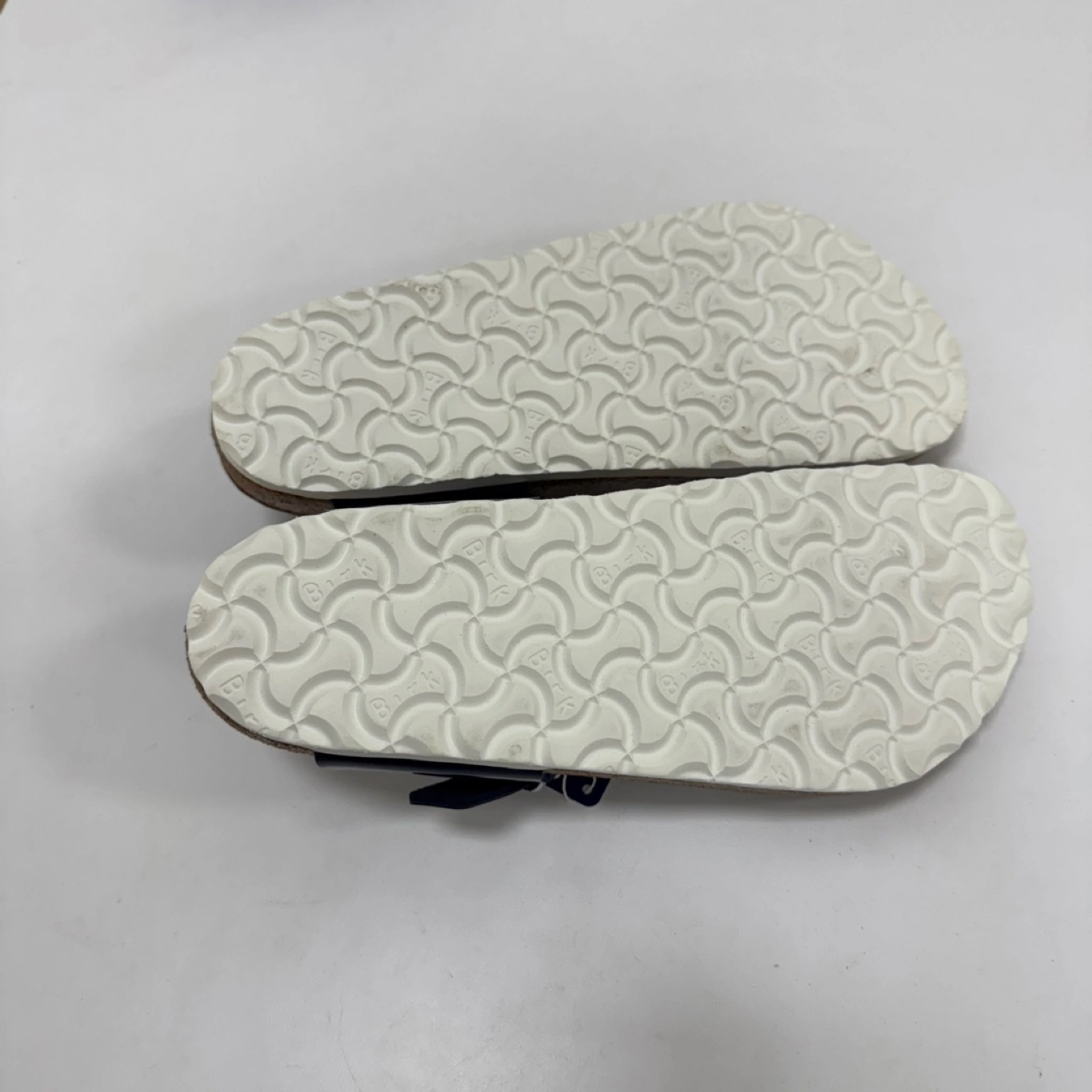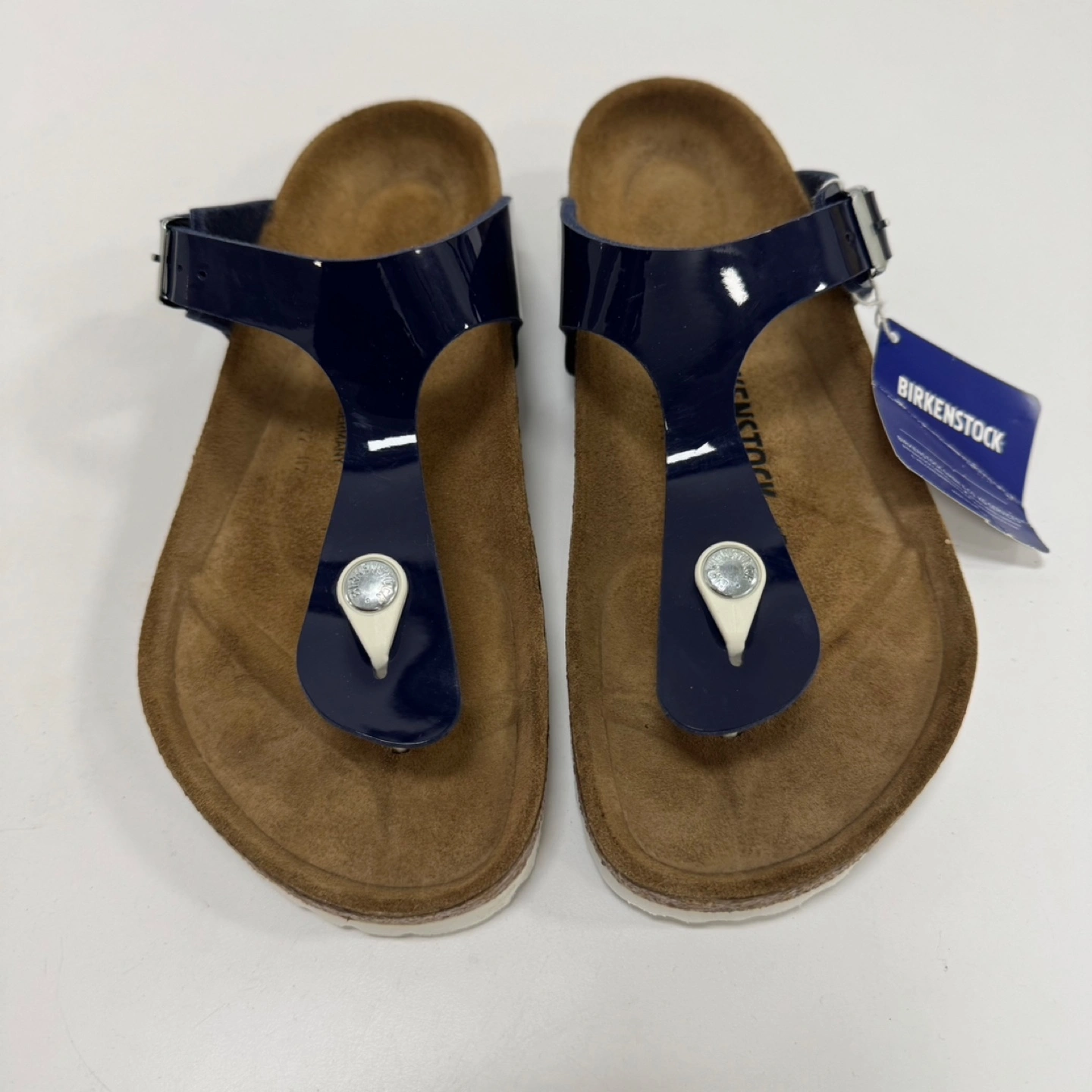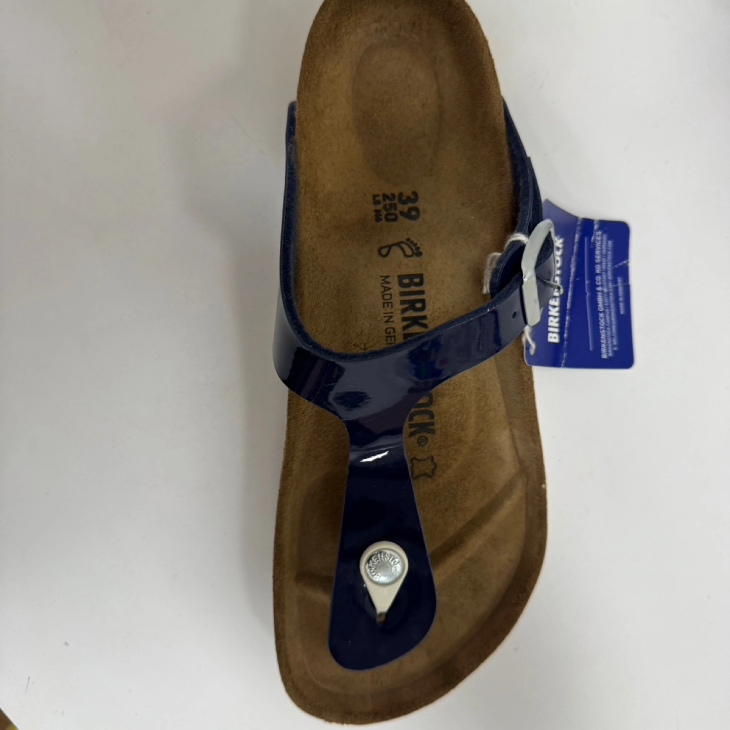 Brand new Birkenstock Gizeh sandals in shiny navy blue with tag still attached.