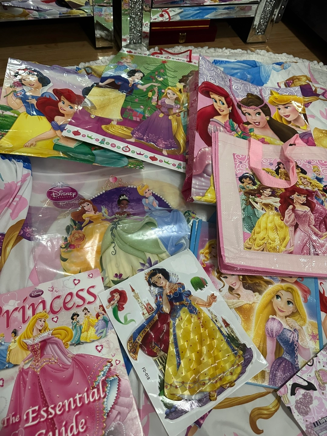 A collection of Disney Princess items! Includes books and tote bags featuring all your favourite princesses like Ariel, Snow White, and Cinderella. Perfect for any little princess fan!