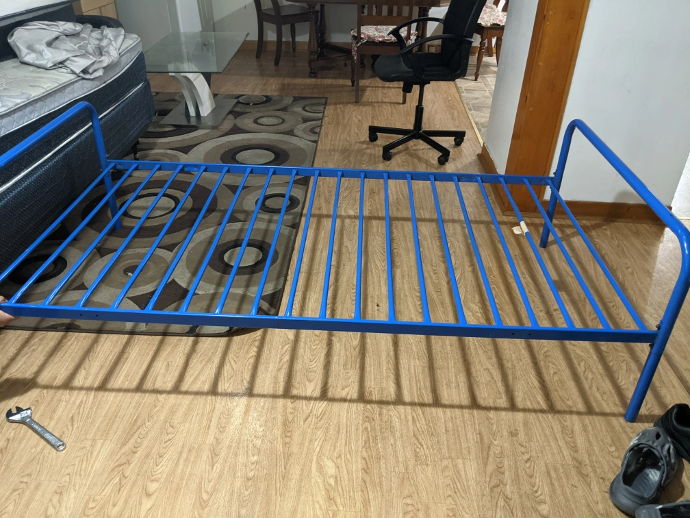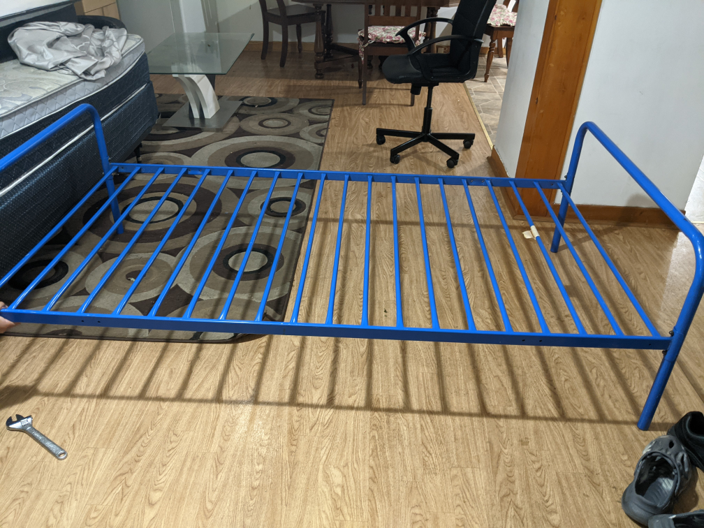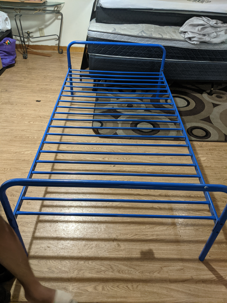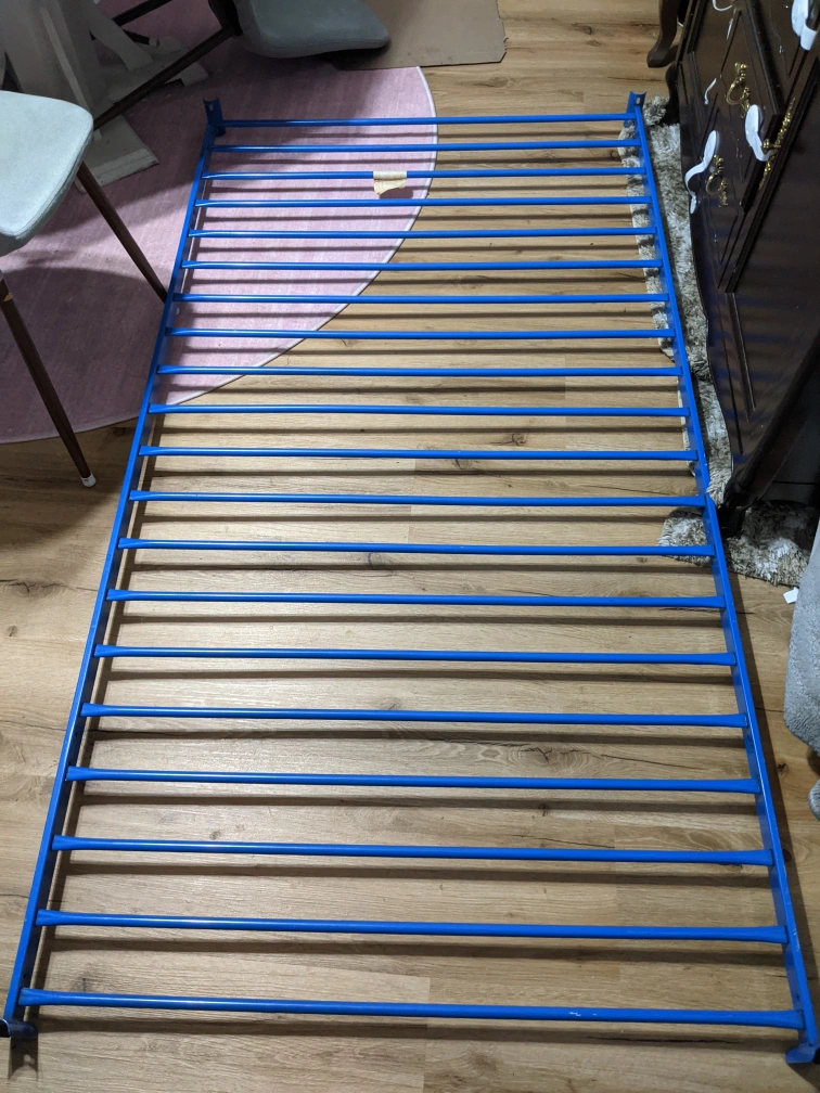 Selling a blue metal bed frame, perfect for a twin size mattress! It's in good condition and ready for a new home. Great for a kid's room or a guest room