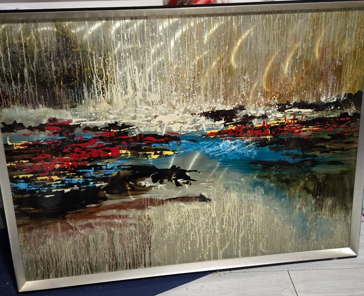 Selling a framed piece of abstract wall art. It features a blend of colours, including gold, red, and blue. It would make a lovely addition to any room!