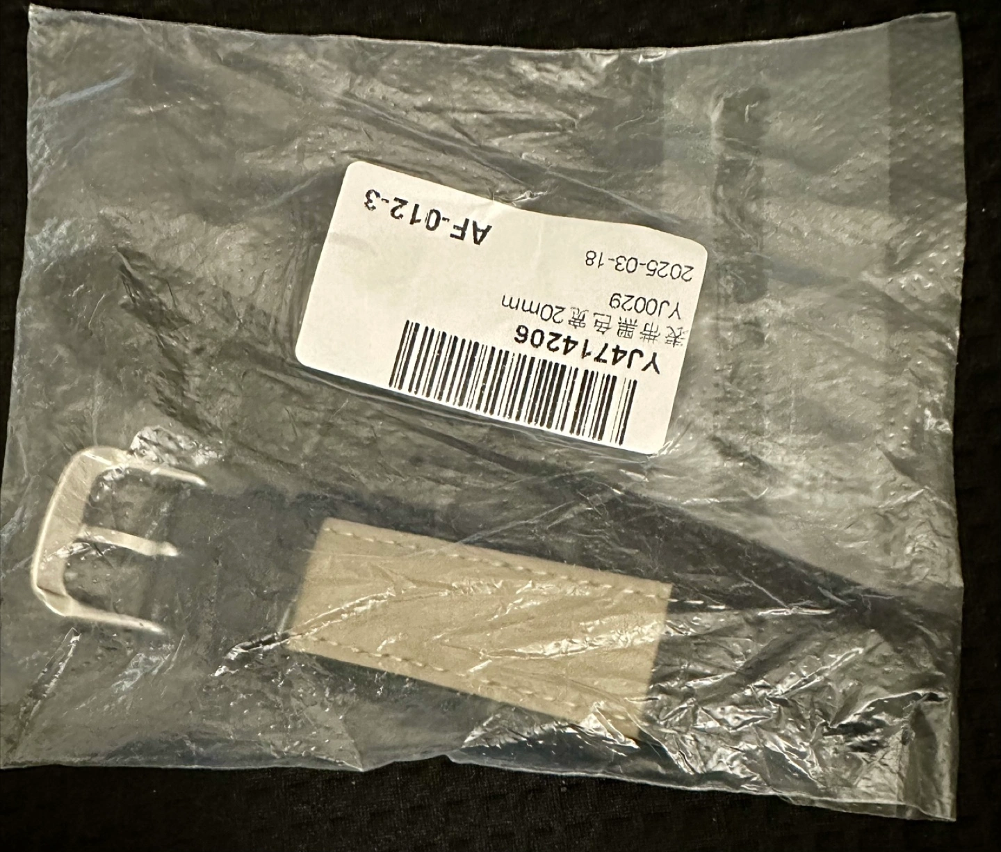Selling a brand new 20mm leather watch band, still sealed in its original packaging! The manufacturing date of March 18, 2025 noted on packaging.