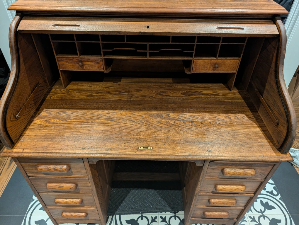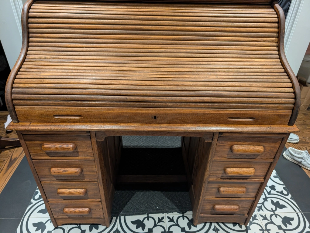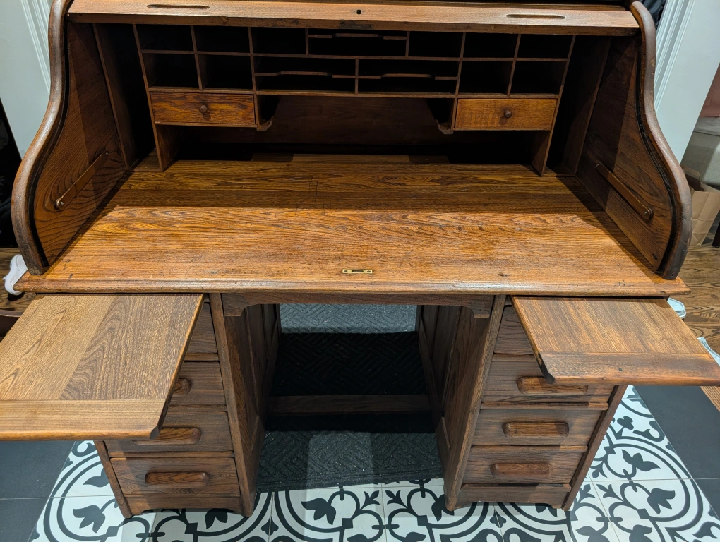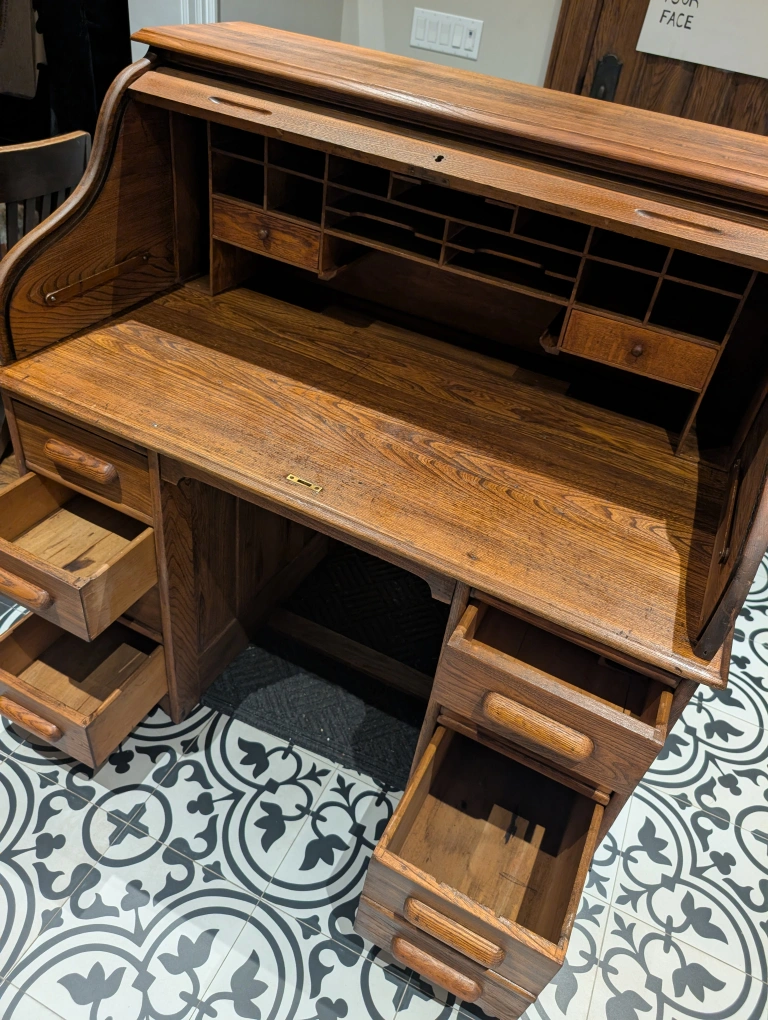Selling a beautiful roll top desk made of solid wood. It features several drawers and compartments, offering lots of storage space. Perfect for a home office or study!