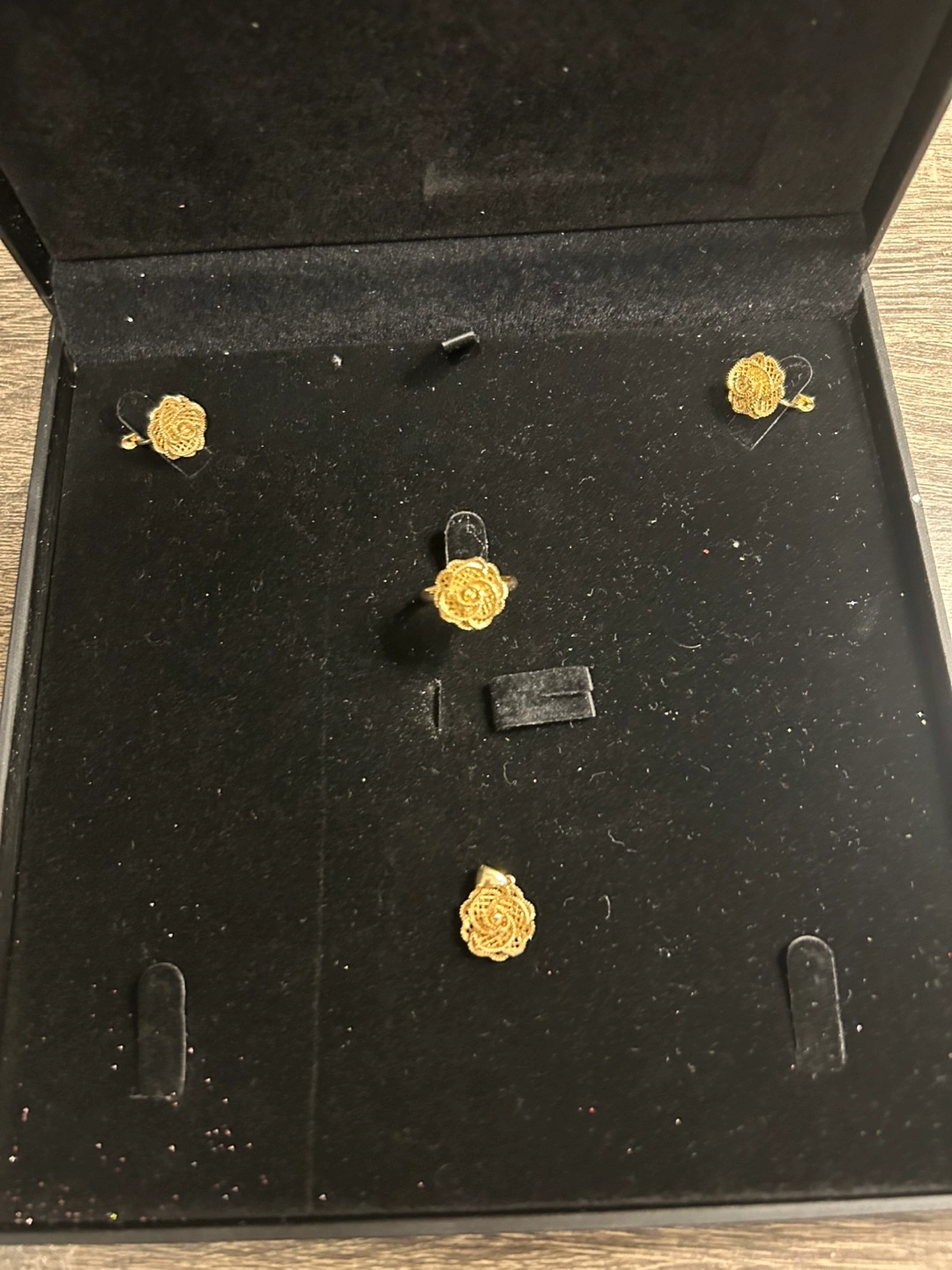 364Selling a beautiful gold ring and pendant set. The set features a delicate floral design. Perfect for adding a touch of elegance to any outfit!