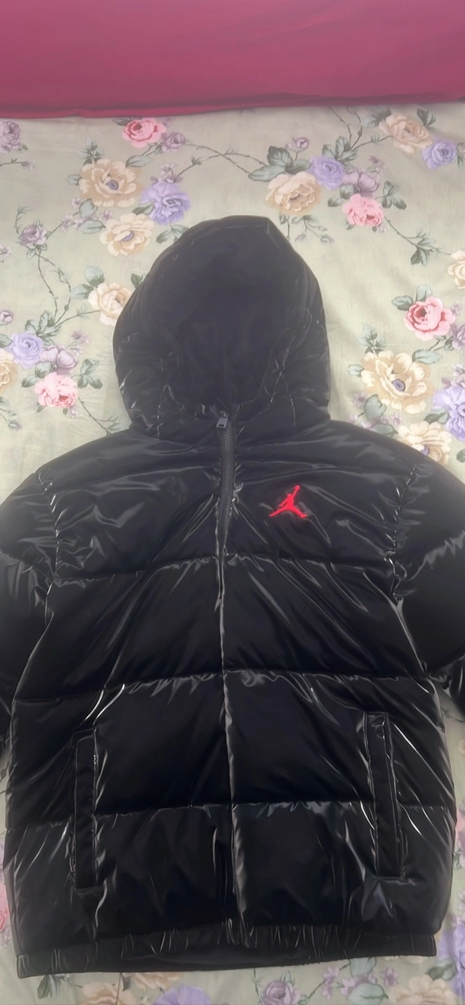 Selling a stylish black Jordan puffer jacket. It's in great condition and perfect for staying warm during the colder months. The jacket features a red Jordan logo.
