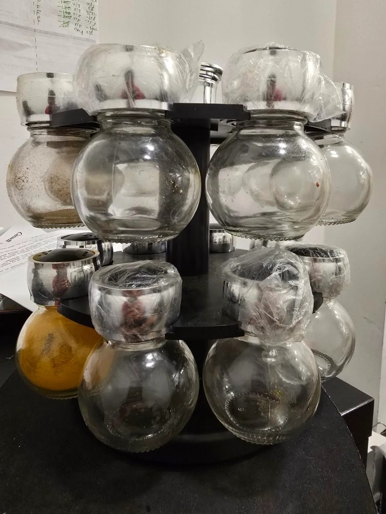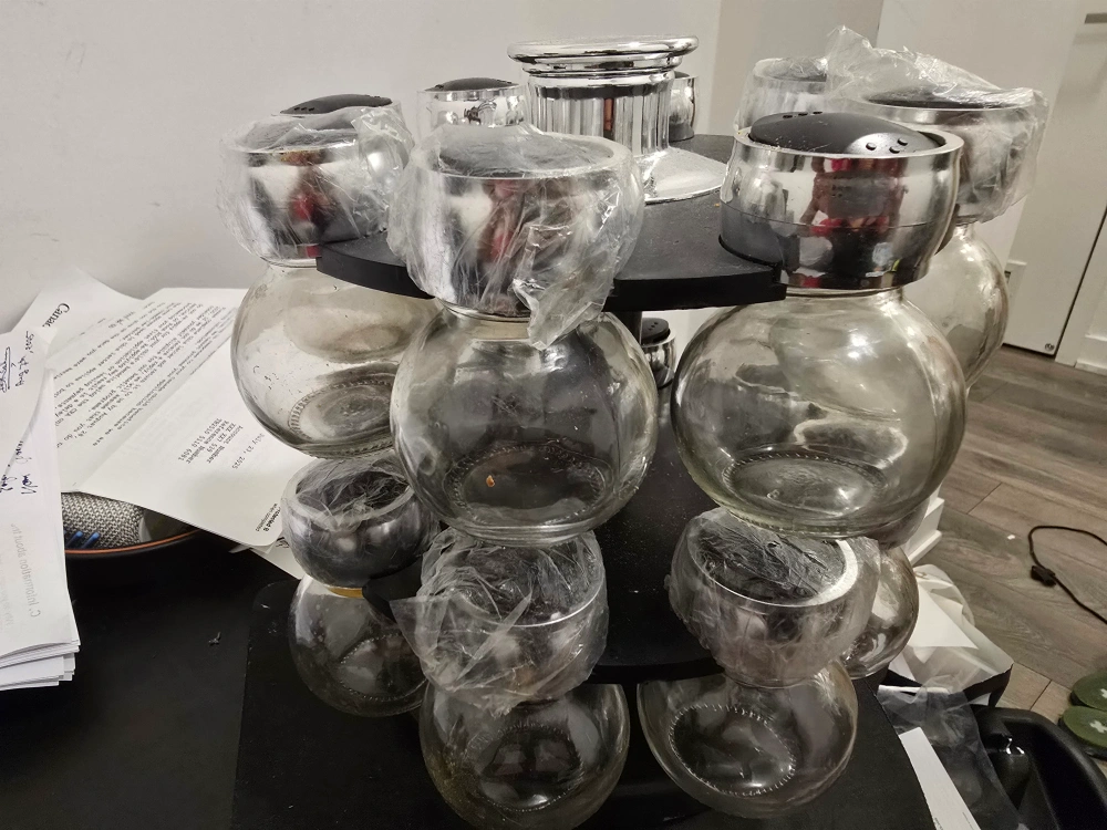 Selling a rotating spice rack that comes with the glass jars. It's a great way to organize your spices and keep them within easy reach while cooking. The rack rotates smoothly, making it easy to find the spice you need. Perfect for any kitchen!