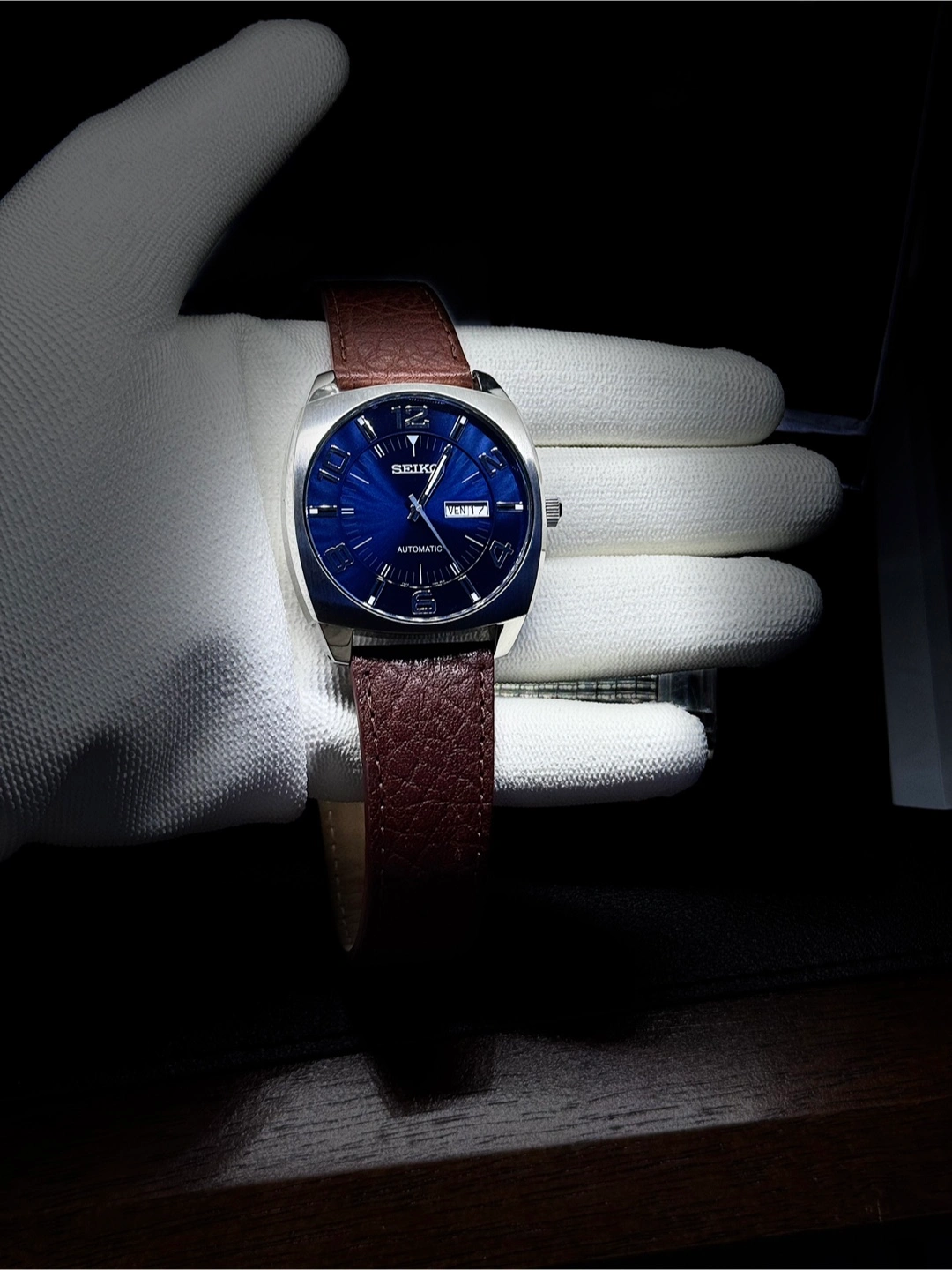Have a part of history with this 70s Recrafted Seiko on a beautiful polished blue dial that Radiates on the wrist!