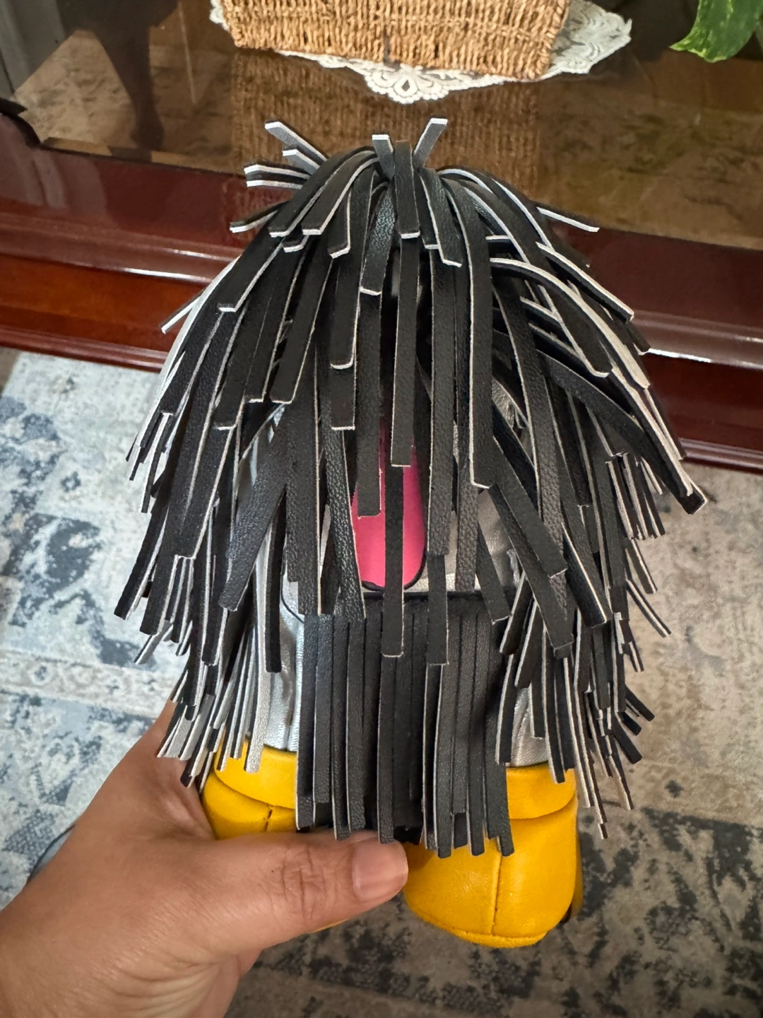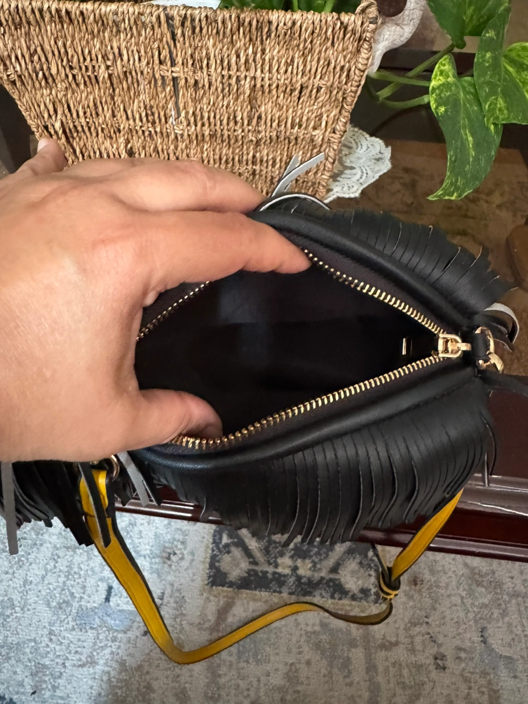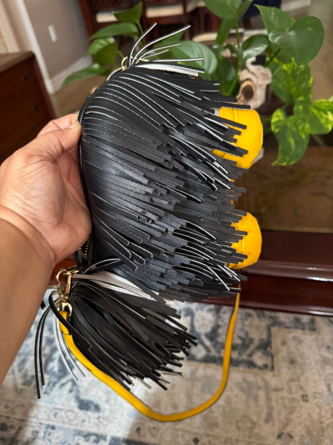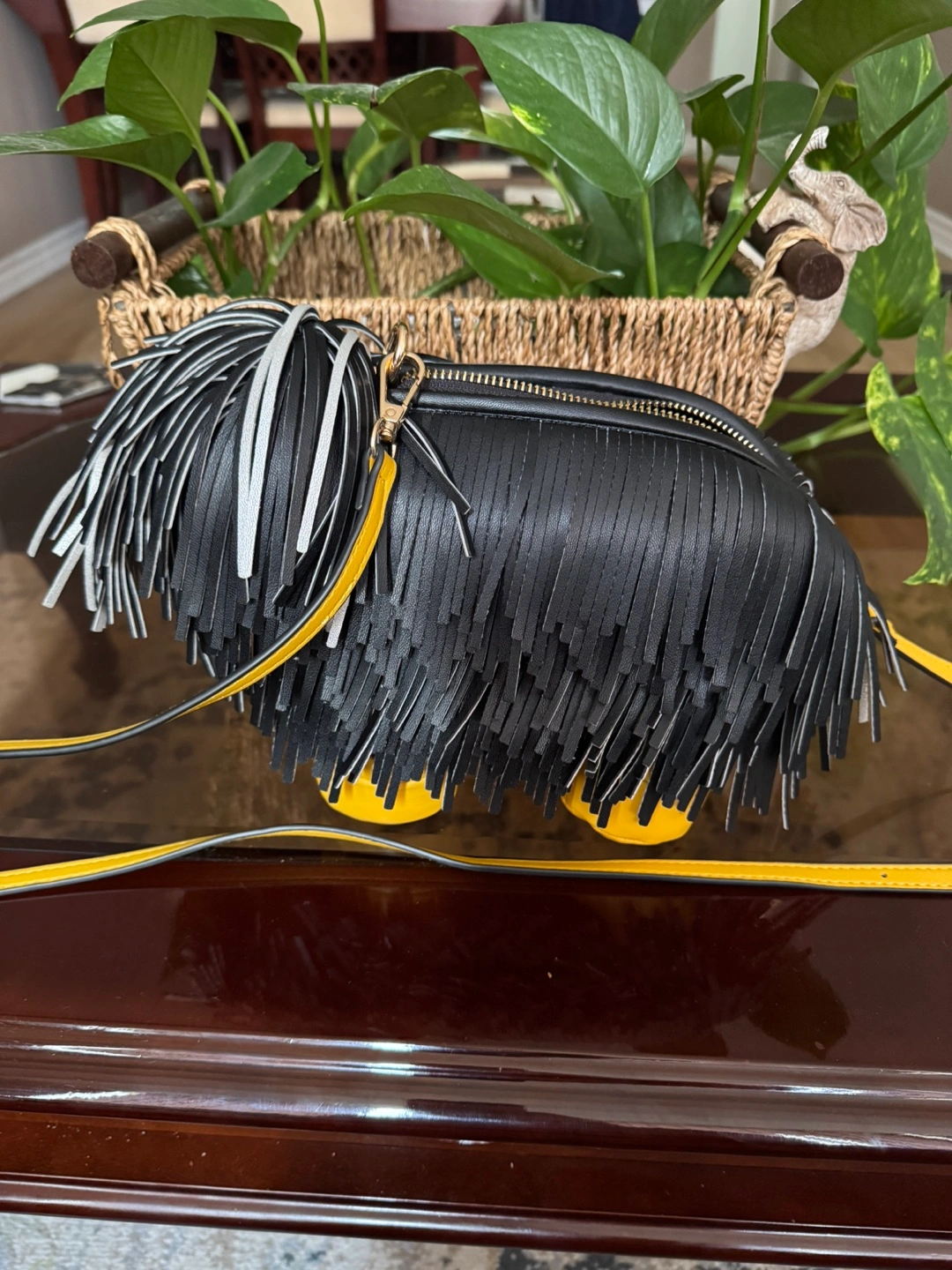548Check out this unique dog shaped fringe crossbody bag! It features a fun, eye-catching design with black fringe detailing and a pop of yellow. Perfect for adding a bit of flair to any outfit!