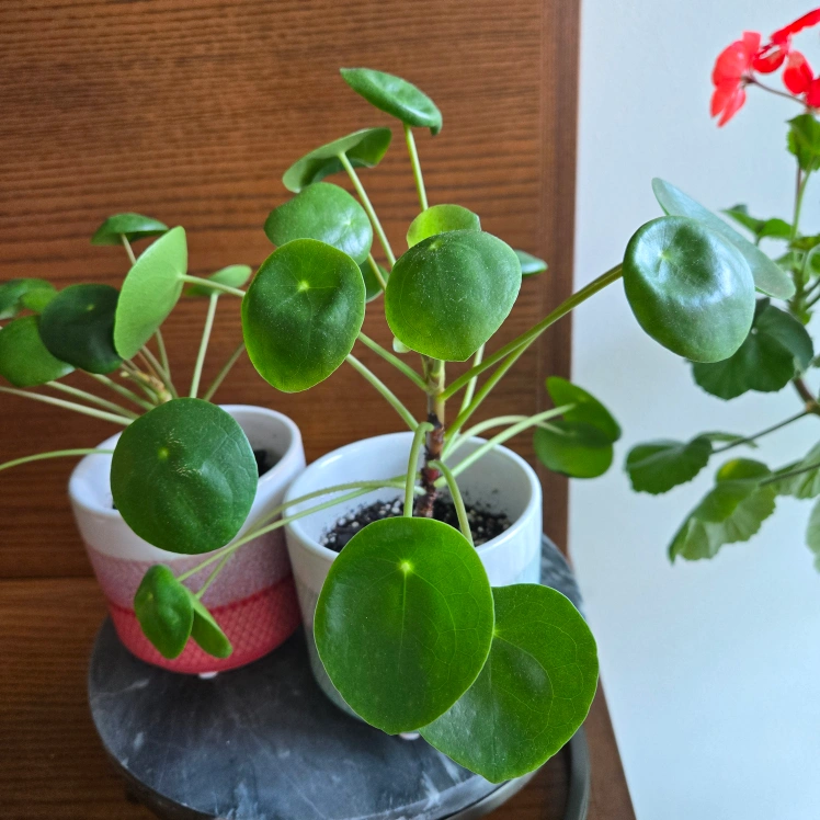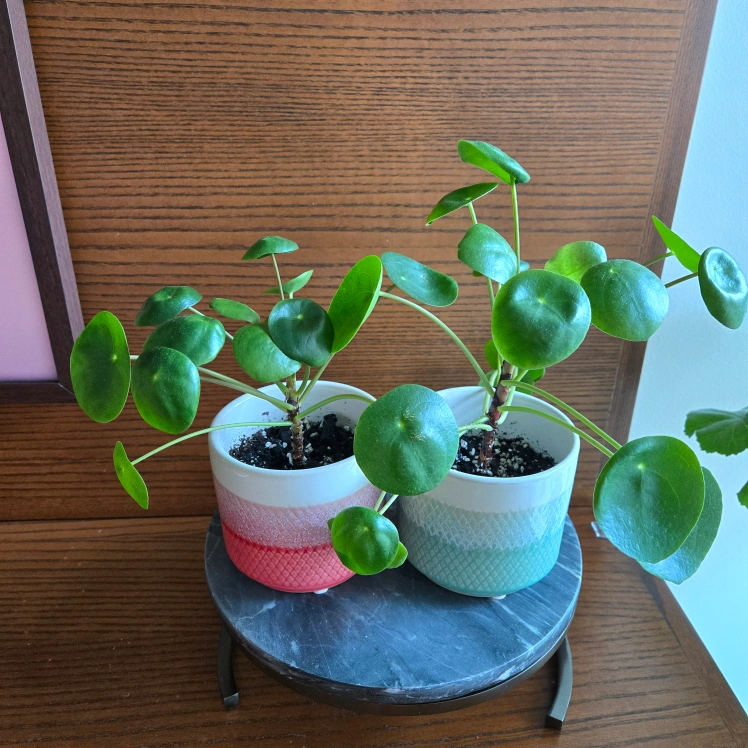 I have a pair of Pilea peperomioides plants, also known as Chinese Money Plants, available. They come in cute, colourful teal and coral ombre pots and are ready to brighten up your space! They're easy to care for and bring a touch of greenery to any room.