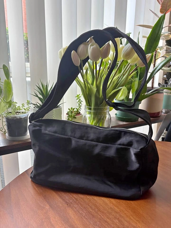 Lightweight black soft shell cross body bag with adjustable strap, and silver zipper closure. Has compartments inside, including a zippered section. The bottom has some structure to shape the bag. Since the strap is adjustable, it can be worn as a shoulder bag, hand bag, or crossbody bag. Great for walking around with your essentials, and can also hold a water bottle, small umbrella, camera, etc. Originally purchased in Korea. See photos for measurements.