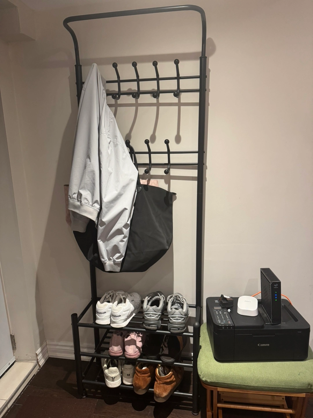 Declutter your entryway with this handy hall tree! It features a coat rack up top and shoe storage shelves at the bottom. Perfect for keeping your jackets, bags, and shoes organized in one spot