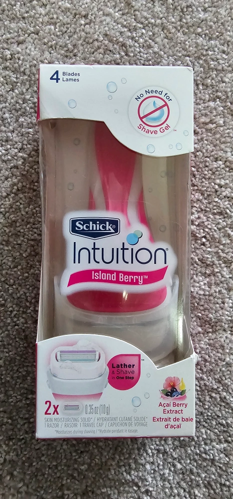 I'm selling a brand new Schick Intuition Island Berry razor! It comes in its original packaging. This razor features 4 blades and a skin moisturizing solid, so there's no need for shave gel. It also has acai berry extract for an extra touch of freshness