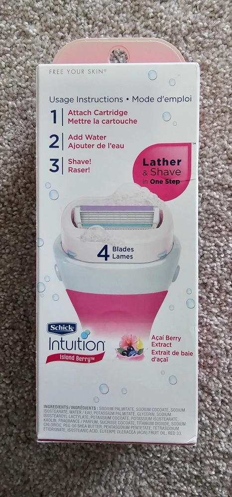 I'm selling a brand new Schick Intuition Island Berry razor! It comes in its original packaging. This razor features 4 blades and a skin moisturizing solid, so there's no need for shave gel. It also has acai berry extract for an extra touch of freshness