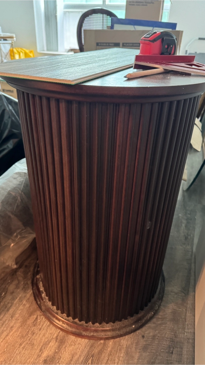Selling a round glass table top with a wooden stand. The glass is in good condition, and the wooden stand has a unique, decorative design. Perfect for adding a touch of elegance to any room!
