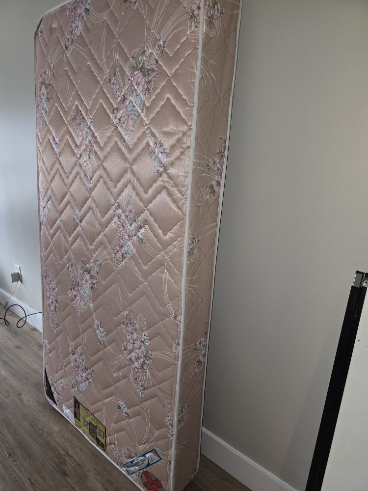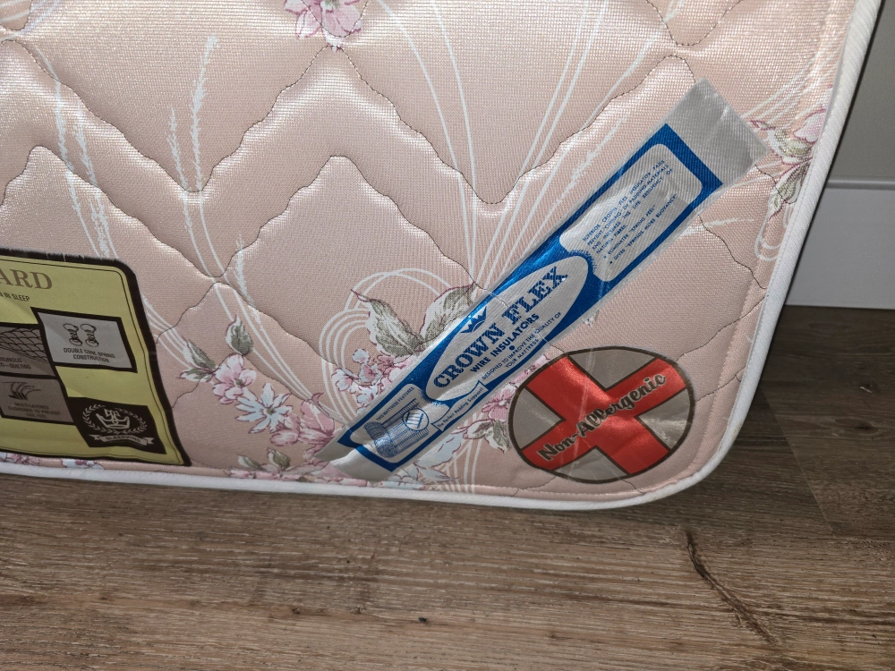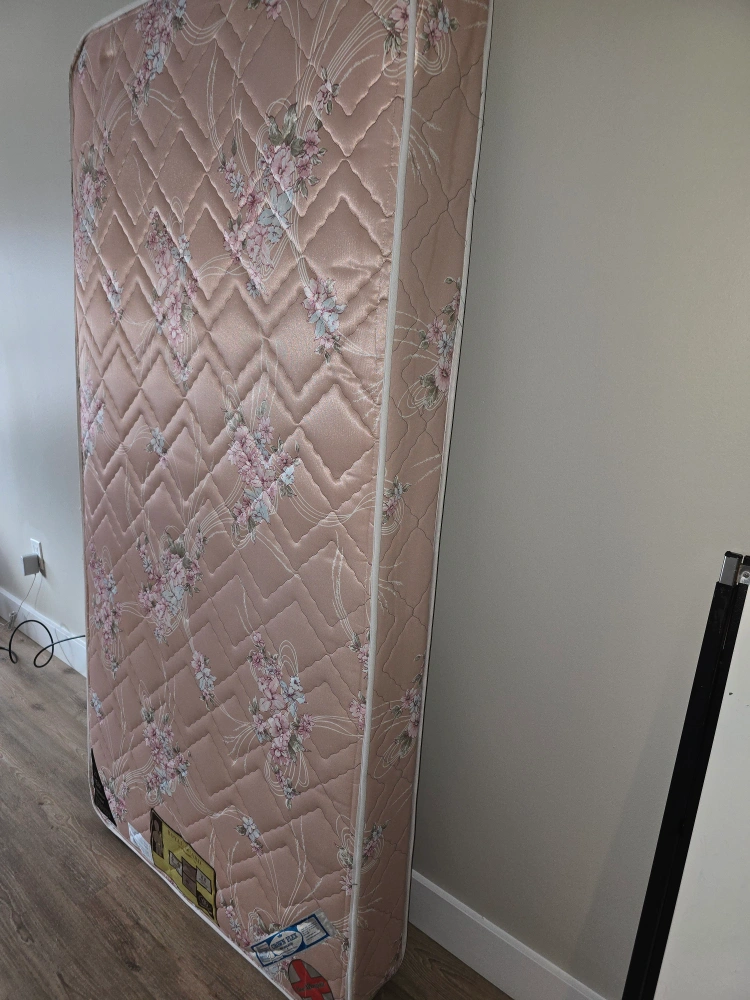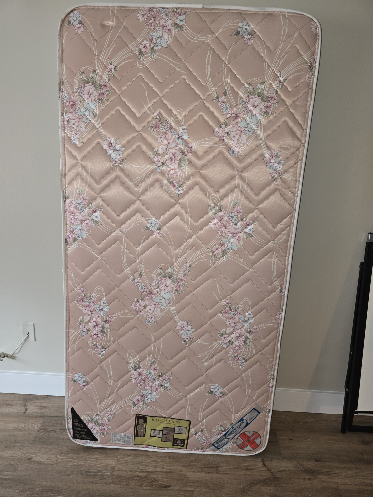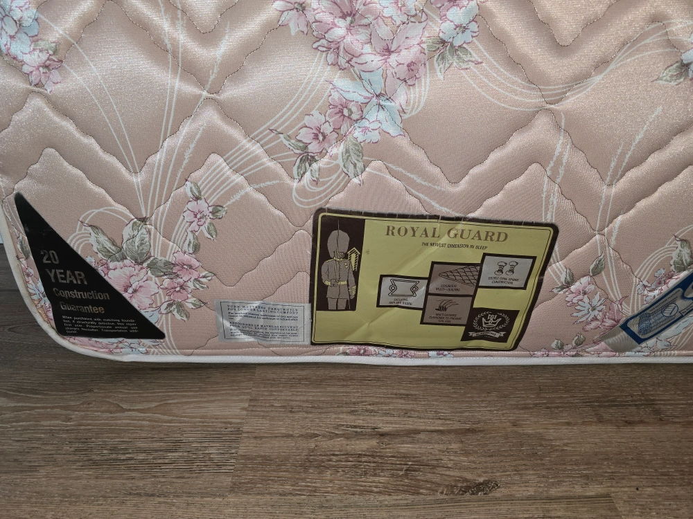 Selling a twin mattress with a lovely floral pattern. It's a Royal Guard mattress, known for its quality and comfort. It appears to be in good condition and is non-allergenic. Perfect for a guest room or a child's bed!