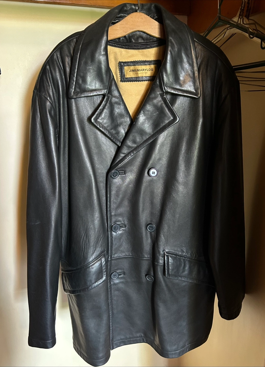 515JIM&MARYLOU black leather coat. It's a double-breasted style. There is some wear on the back.