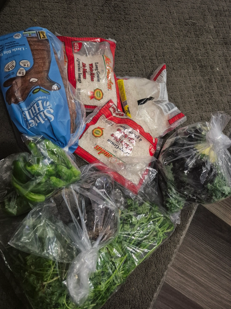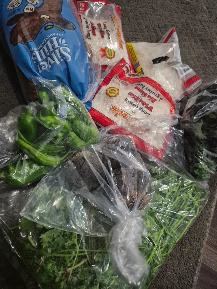 The image shows a small collection of groceries, including a loaf of Silver Hills sprouted bread, three bags of L'Amour long grain white rice, and several bags of fresh produce such as green peppers, dark leafy greens, and what appears to be beetroot