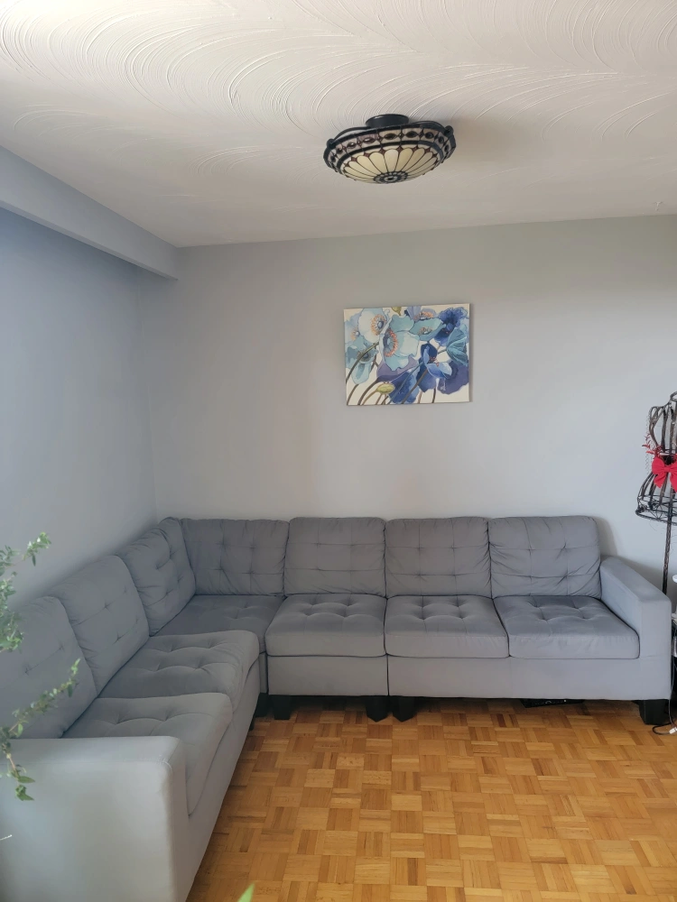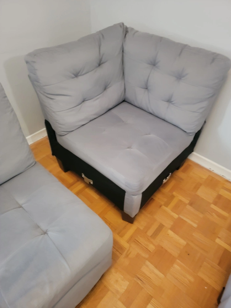 Selling a grey modular sectional sofa set. It's in very good condition and has a modern look. Perfect for a living room or entertainment area!