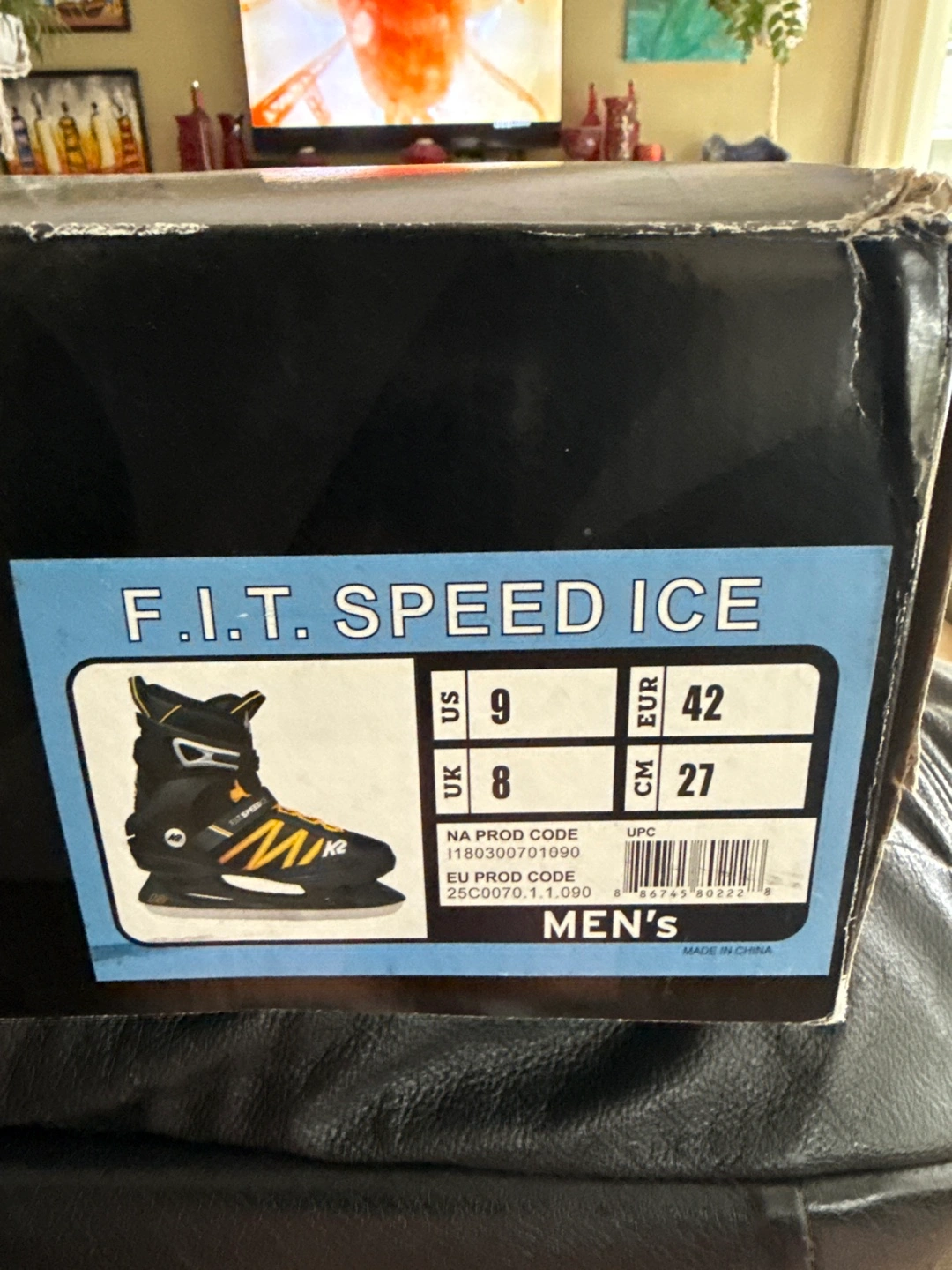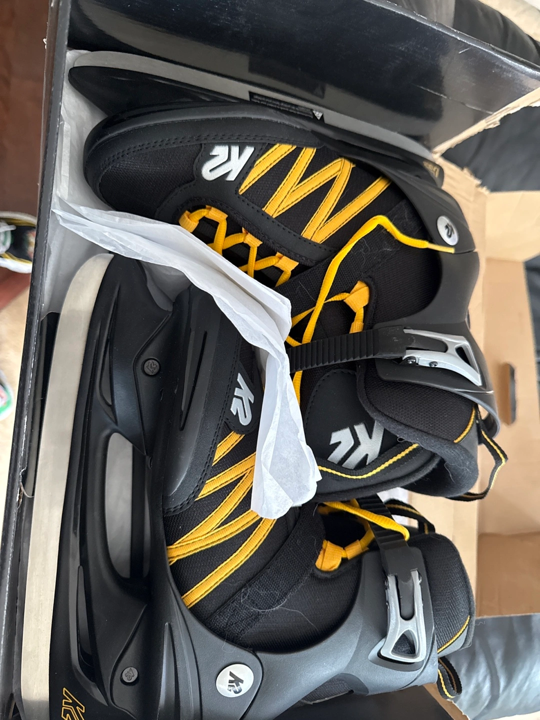 Selling a pair of K2 F.I.T. Speed Ice skates in men's size 9. They are black with yellow accents and come in the original box. Perfect for hitting the ice this winter!