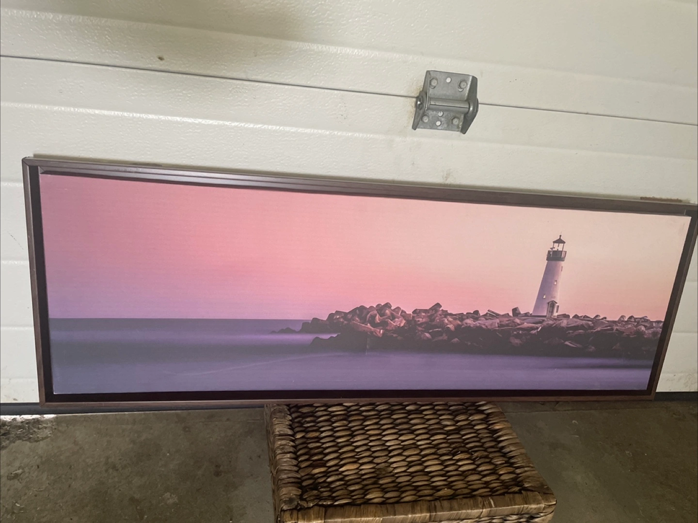 A framed print featuring a beautiful lighthouse scene. It's in great shape and ready to add a touch of coastal charm to your home
