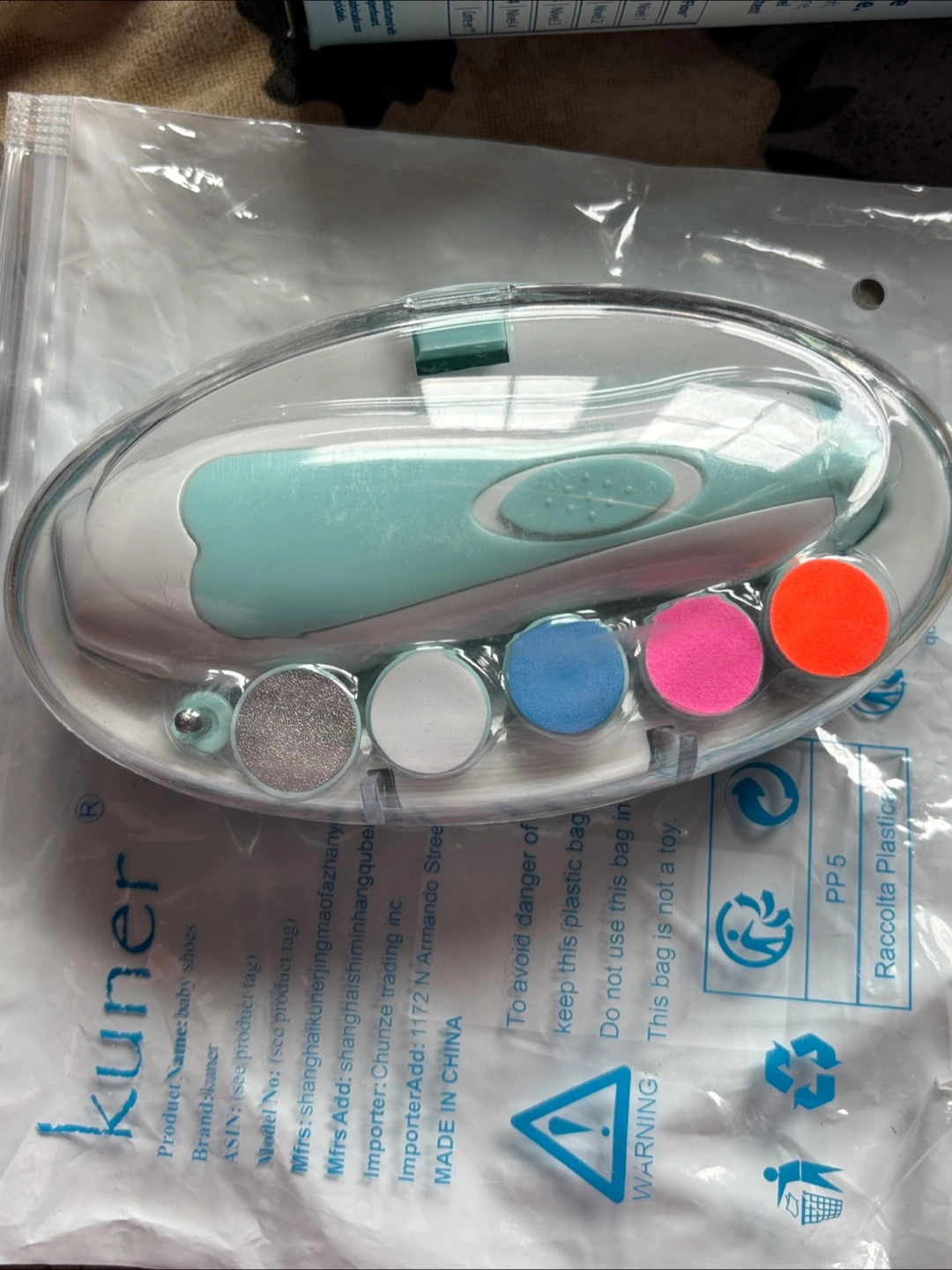 Selling a brand new Kuner baby nail trimmer! It comes with multiple attachments for different stages of baby's nail growth. The set is complete and still in its original packaging, making it a great and safe tool for keeping your little one's nails trimmed