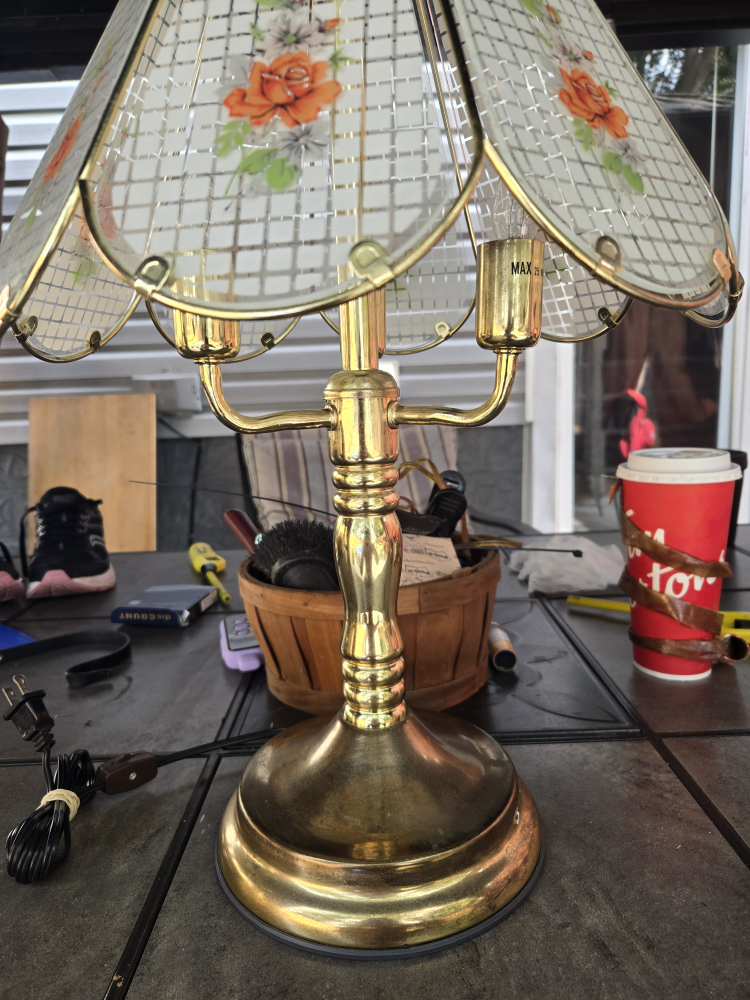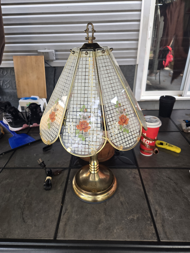 Selling a vintage-style table lamp! It features a gold-tone base and a patterned shade with floral accents. It requires three bulbs, each with a max of 25W.