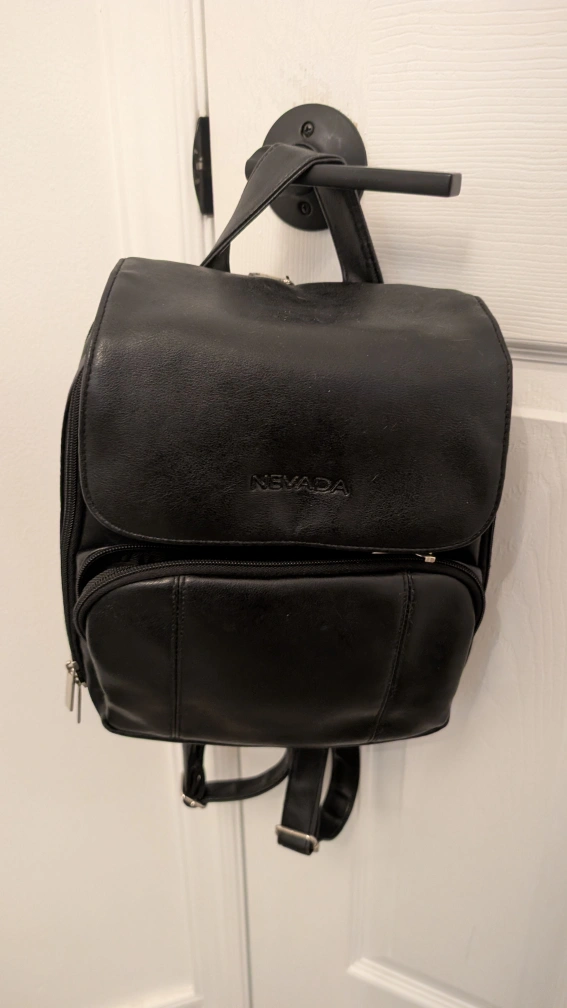 Here's a stylish black leather backpack from Nevada! It's in great condition and perfect for everyday use or travel. The backpack features a classic design with multiple compartments for easy organization. It's a versatile and durable bag that will complement any outfit!