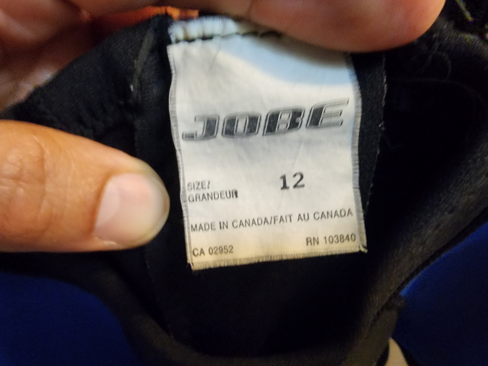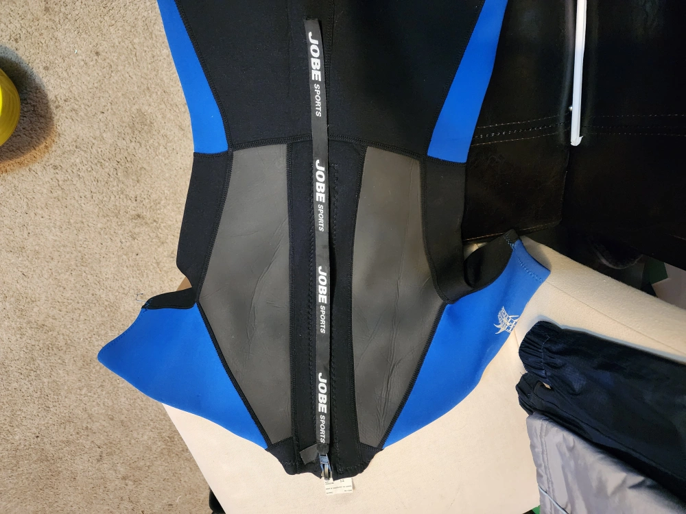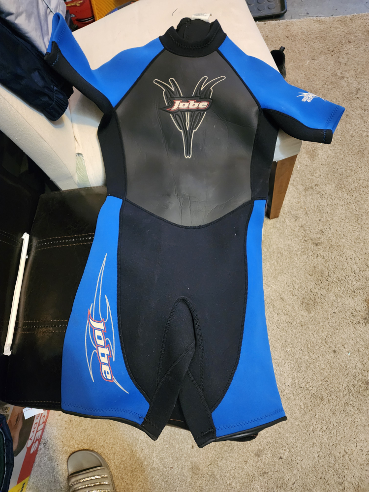 Selling a Jobe shorty wetsuit in blue and black. It's a size 12 and features Powerstretch flat stitch construction. Great for water sports! couldn't find the thickness or rating.