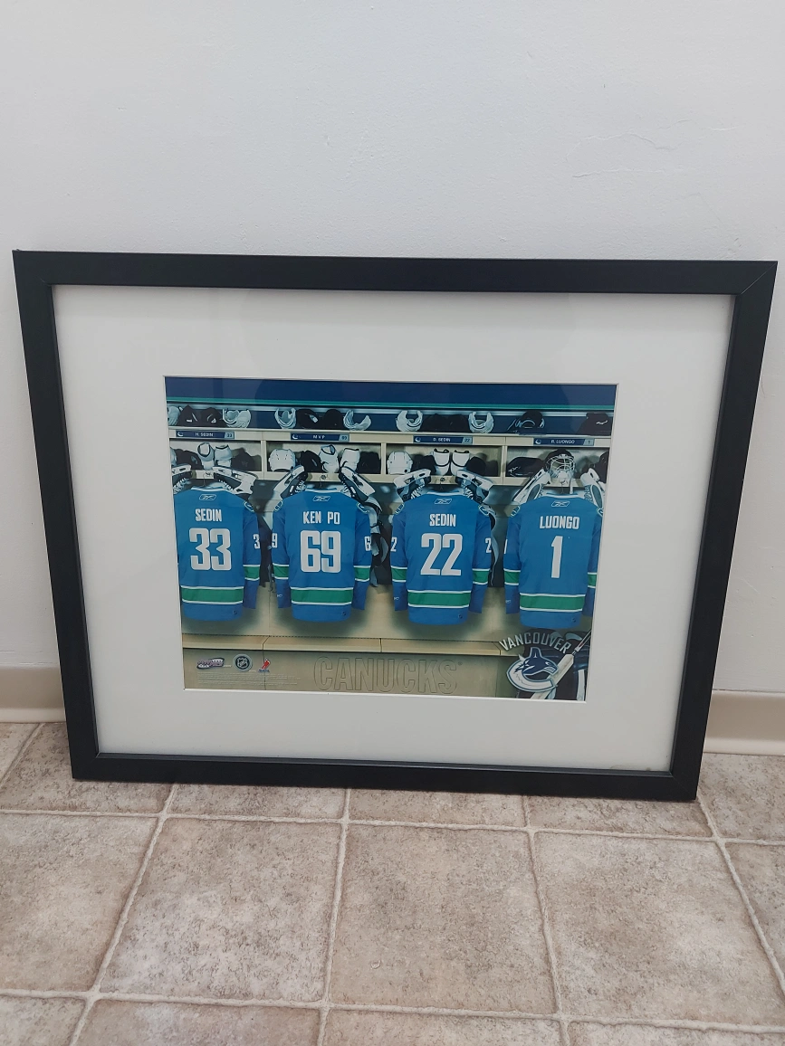 Framed print featuring Vancouver Canucks jerseys in a locker room setting. It's a great piece for any Canucks fan!