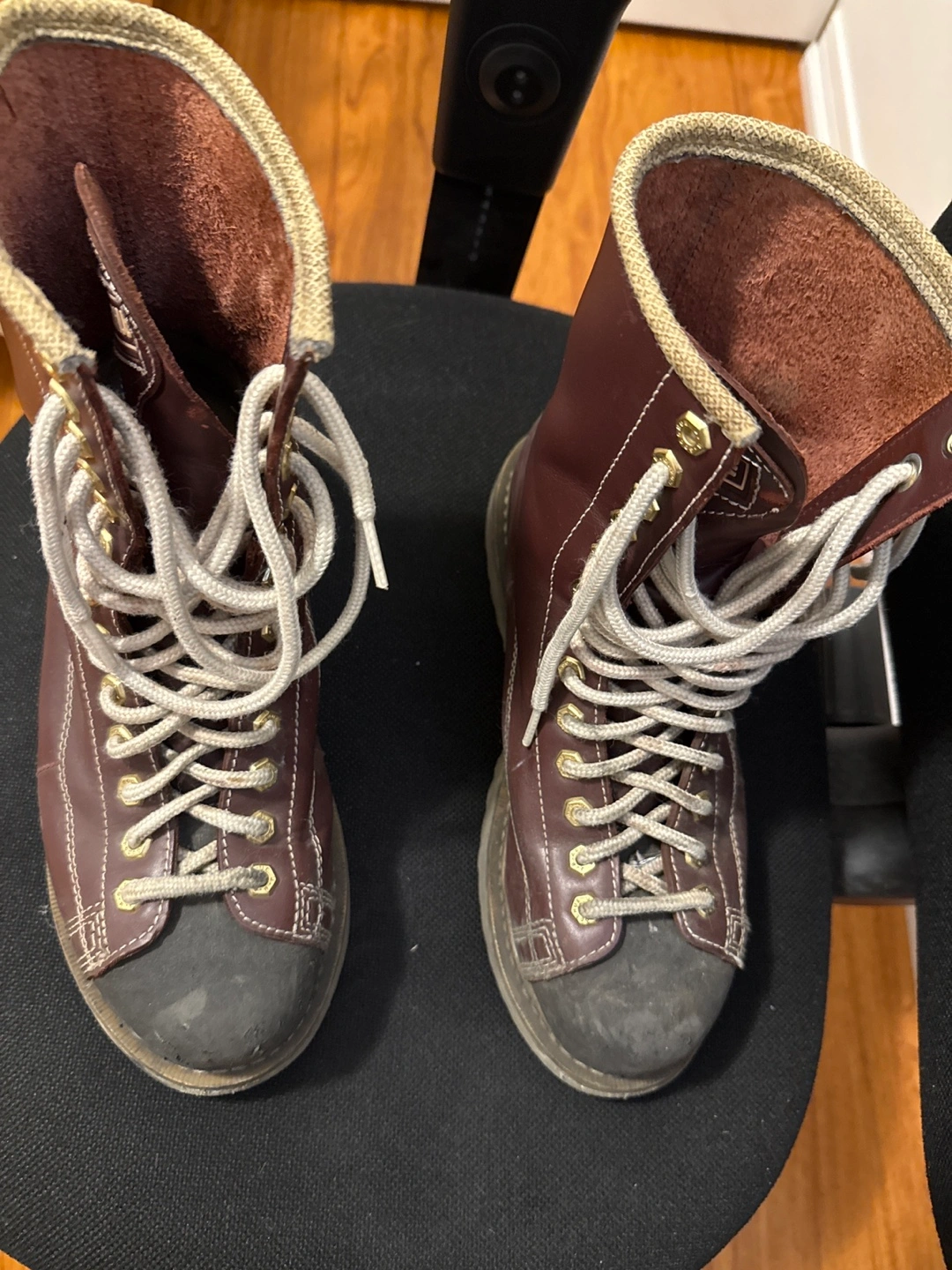 These Goodyear Welt work boots are made of brown leather and feature a distinctive design. They show signs of wear, but are still sturdy and ready for work! They have laces and a high-top design.