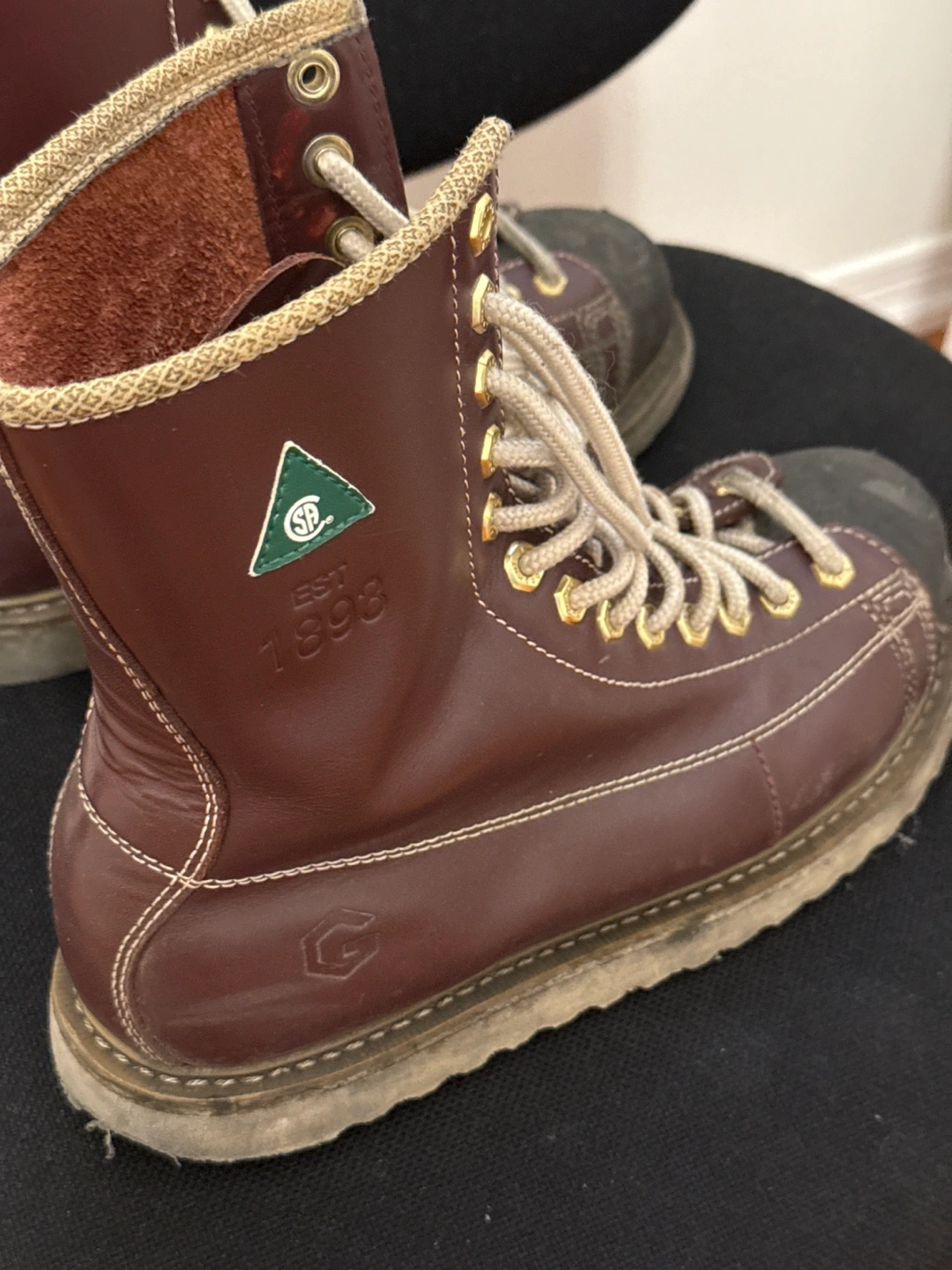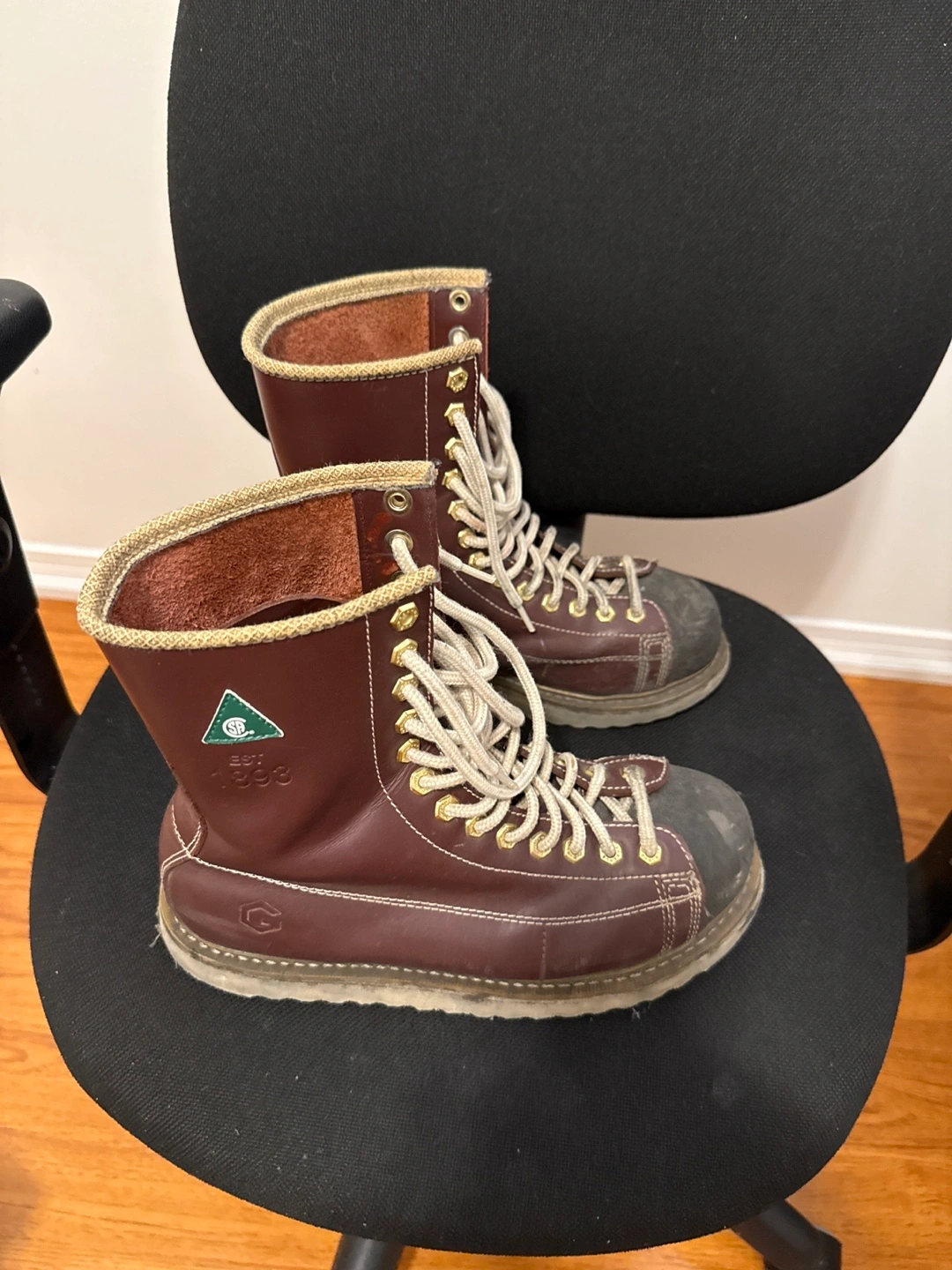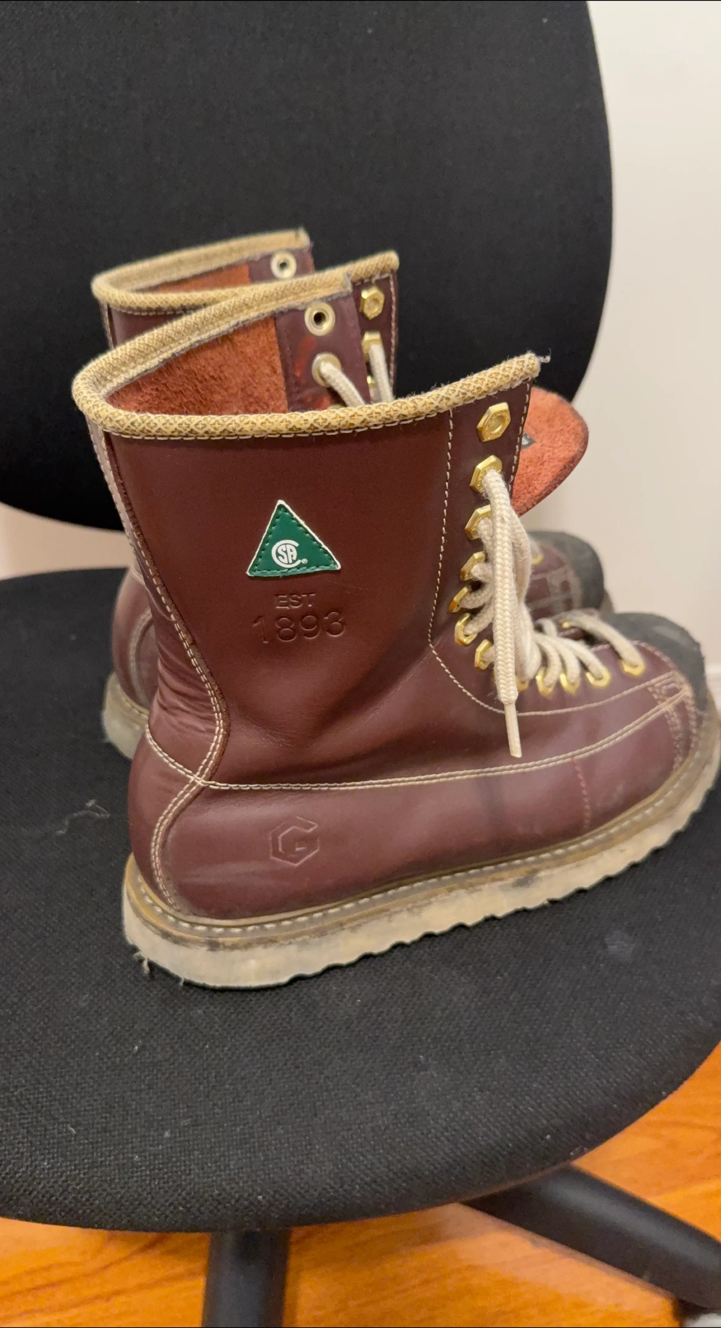 These Goodyear Welt work boots are made of brown leather and feature a distinctive design. They show signs of wear, but are still sturdy and ready for work! They have laces and a high-top design.