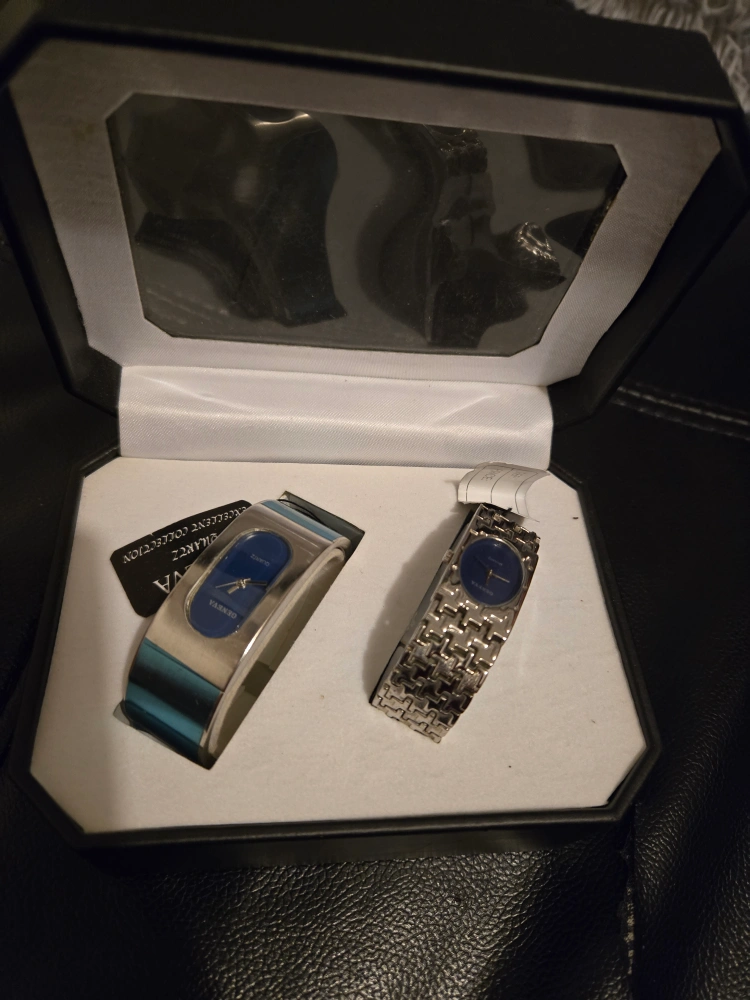 Selling a set of two Geneva quartz watches. They come in a box, making it a nice set! One watch has a blue and silver band, while the other is silver. Both have blue faces