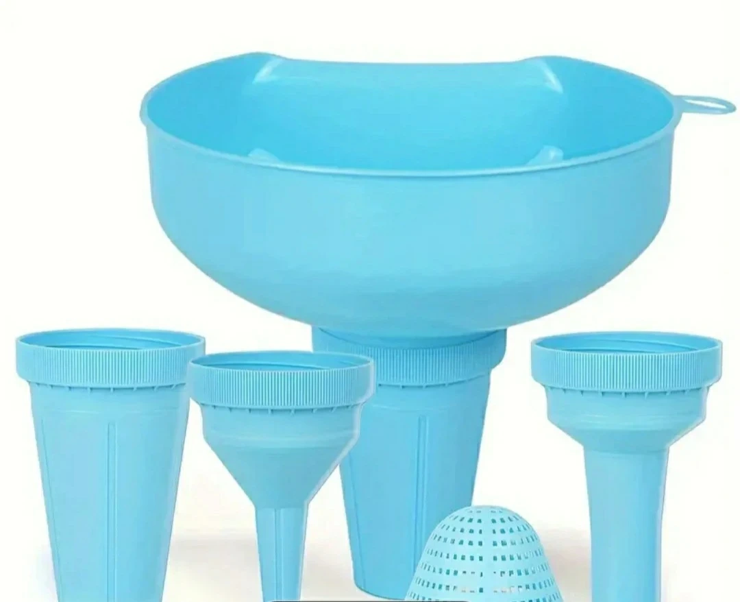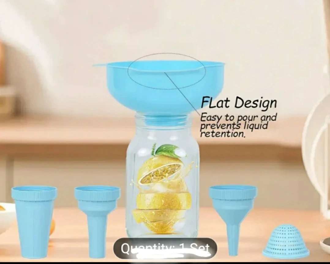 Check out this multi-purpose funnel set! It features a wide funnel and comes with various spouts, including large, medium, and small sizes. The set also includes a strainer and a brush, making it perfect for all your pouring needs. The flat design makes it easy to pour and prevents liquid retention