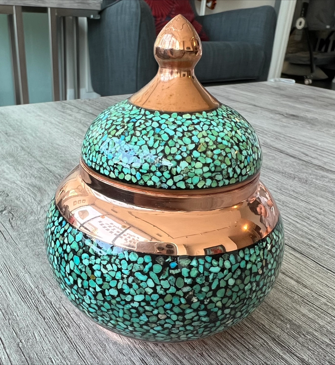 167This is a beautiful decorative jar featuring copper accents. It would make a lovely addition to any home decor.
